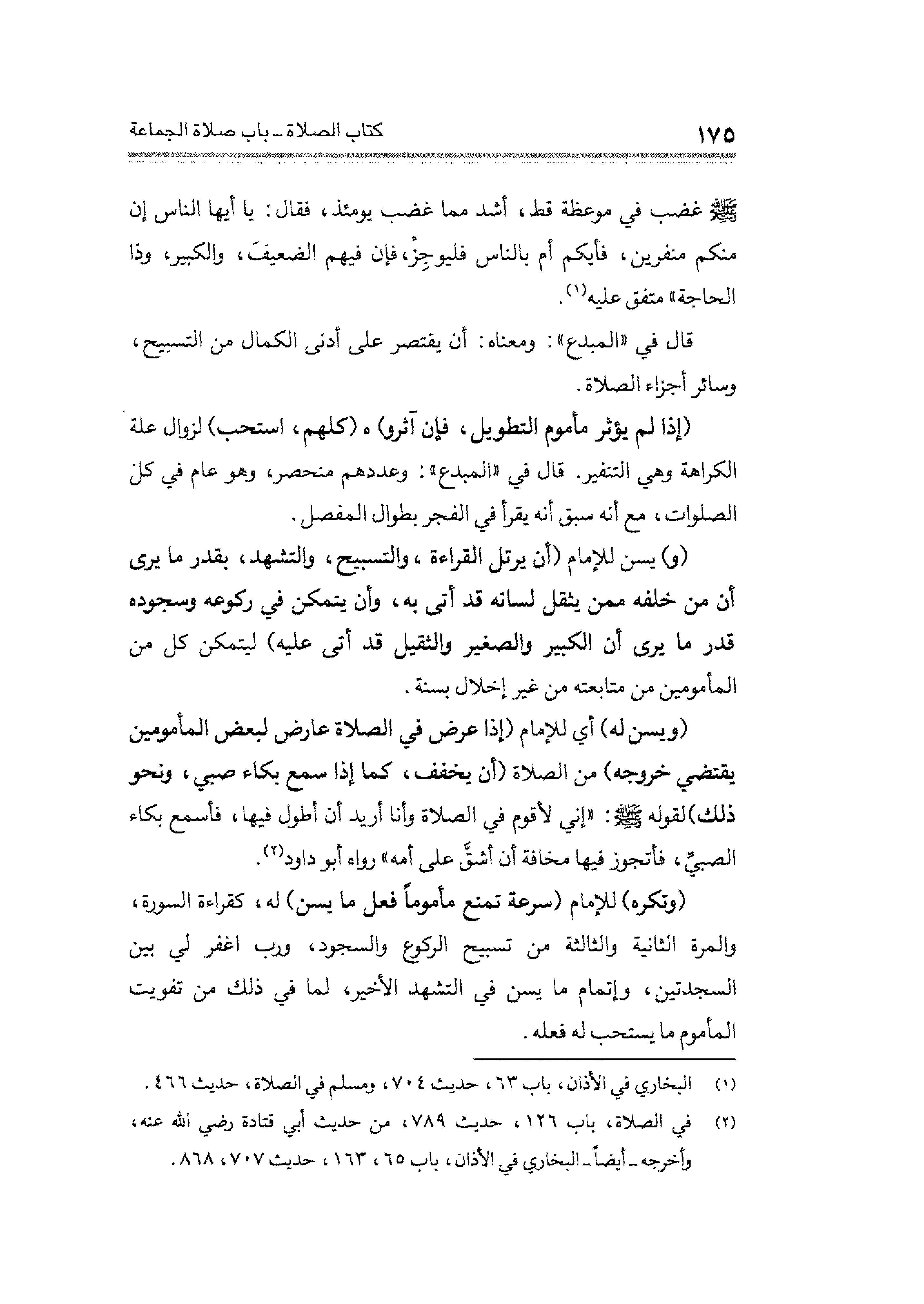 (ويسن له) أي للإمام (إذا عرض في الصلاة عارض لبعض المأمومين بقتضي خروجه) من الصلاة (أن يخفف، كما إذا سمع بكاء صبي، ونحو ذلك) لقوله - صلى الله عليه وسلم -: "إني لأقوم في الصلاة وأنا أريد أن أطول فيها، فأسمع بكاء الصبيِّ، فأتجوز فيها مخافة أن أشق على أمه" رواه أبو داود (¬٢)، (وتكره) للإمام (سرعة تمنع مأمومًا فعل ما يسن) له، كقراءة السورة، والمرة الثانية والثالثة من تسبيح الركوع والسجود، ورب اغفر لي بين السجدتين، وإتمام ما يسن في التشهد الأخير، لما في ذلك من تفويت المأموم ما يستحب له فعله.