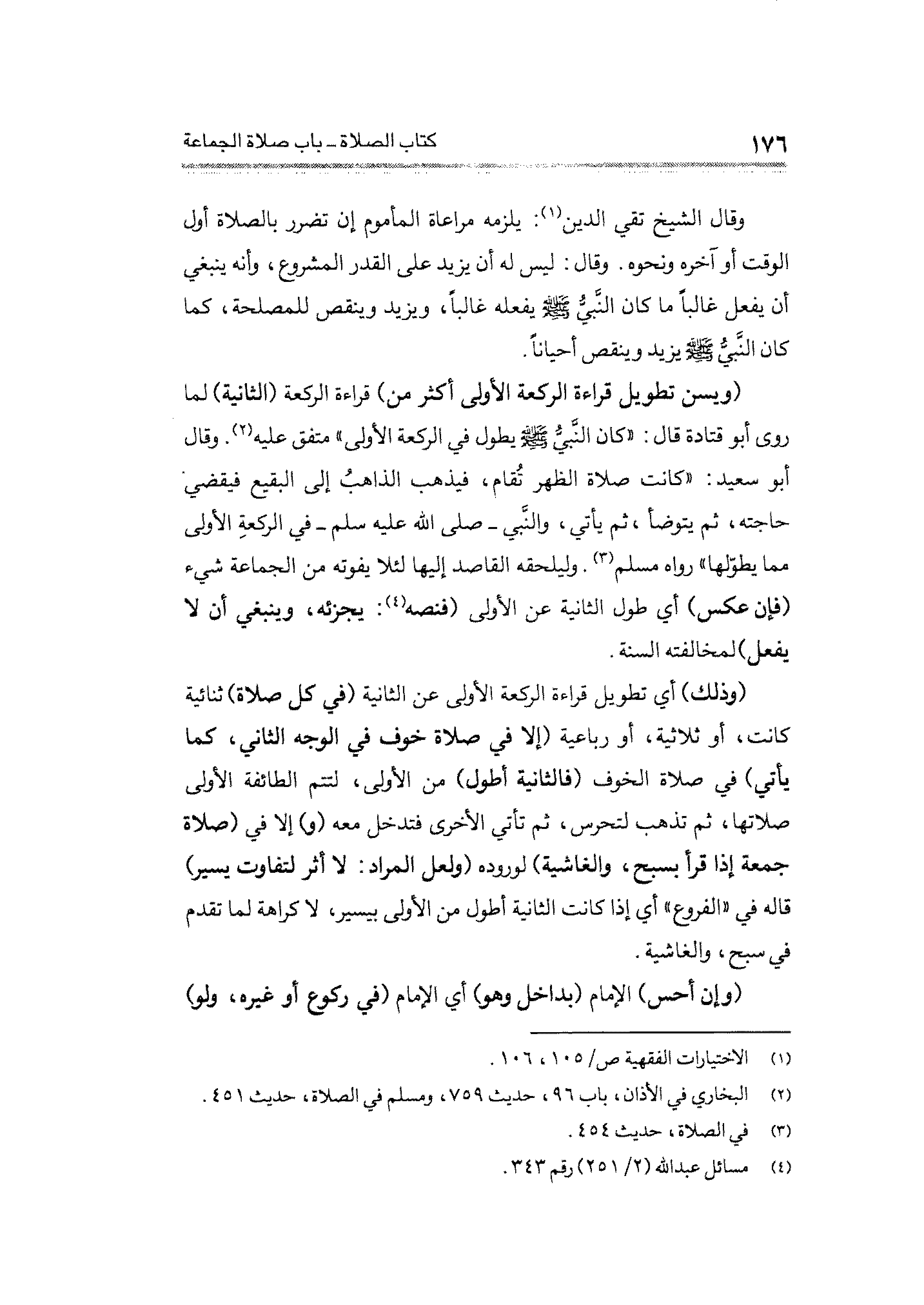 وقال الشيخ تقي الدين (¬١): يلزمه مراعاة المأموم إن تضرر بالصلاة أول الوقت أو آخره ونحوه. وقال: ليس له أن يزيد على القدر المشروع، وأنه ينبغي أن يفعل غالبًا ما كان النَّبيُّ - صلى الله عليه وسلم - يفعله غالبًا، ويزيد وينقص للمصلحة، كما كان النَّبيُّ - صلى الله عليه وسلم - يزيد وينقص أحيانًا.
