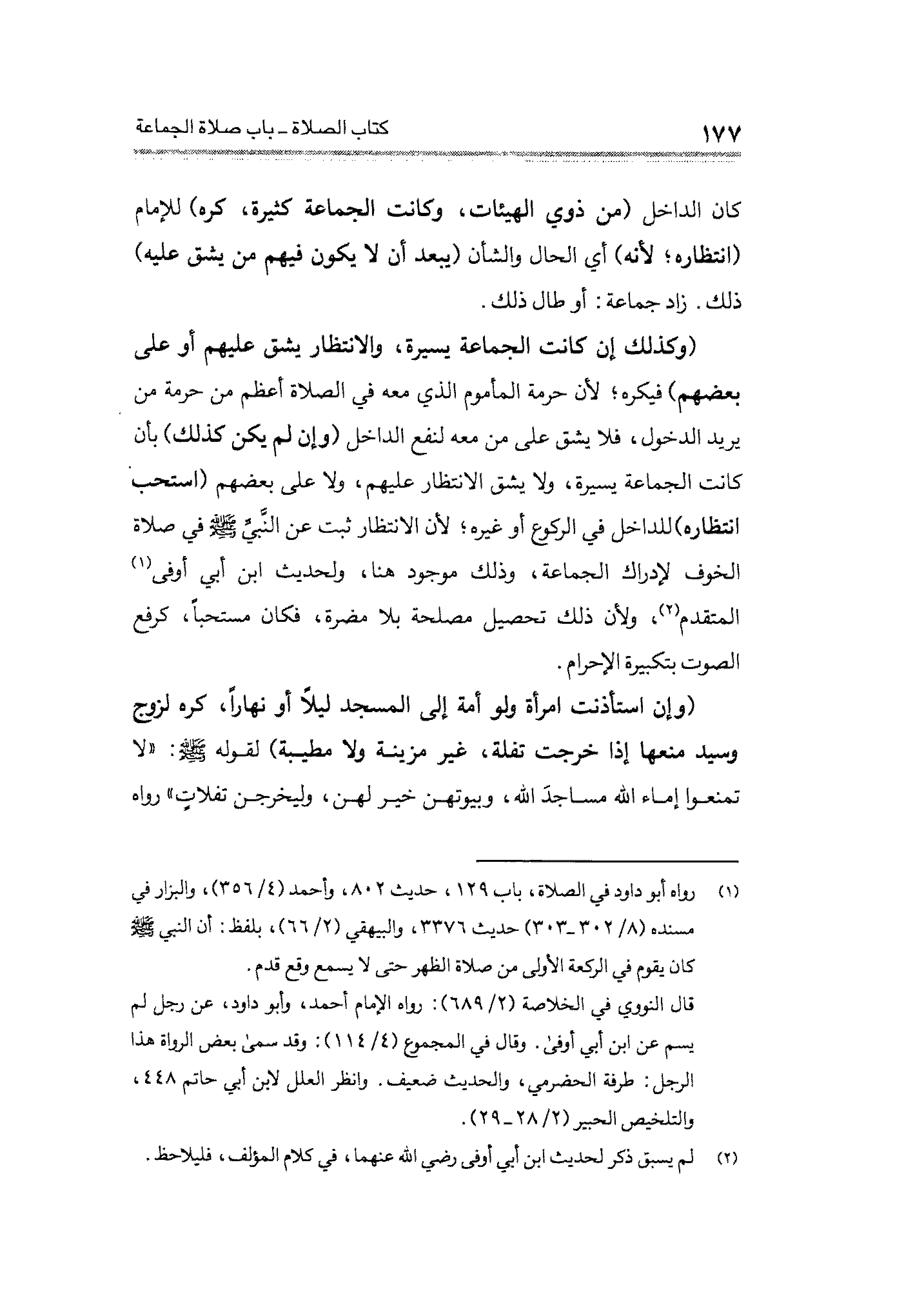 (وكذلك إن كانت الجماعة يسيرة، والانتظار يشق عليهم أو على بعضهم) فيكره؛ لأن حرمة المأموم الذي معه في الصلاة أعظم من حرمة من يريد الدخول، فلا يشق على من معه لنفع الداخل (وإن لم يكن كذلك) بأن كانت الجماعة يسيرة، ولا يشق الانتظار عليهم، ولا على بعضهم (استحبْ انتظاره) للداخل في الركوع أو غيره؛ لأن الانتظار ثبت عن النبَّيِّ - صلى الله عليه وسلم - في صلاة الخوف لإدراك الجماعة، وذلك موجود هنا، ولحديث ابن أبي أوفى (¬١) المتقدم (¬٢)، ولأن ذلك تحصيل مصلحة بلا مضرة، فكان مستحبًا، كرفع الصوت بتكبيرة الإحرام.