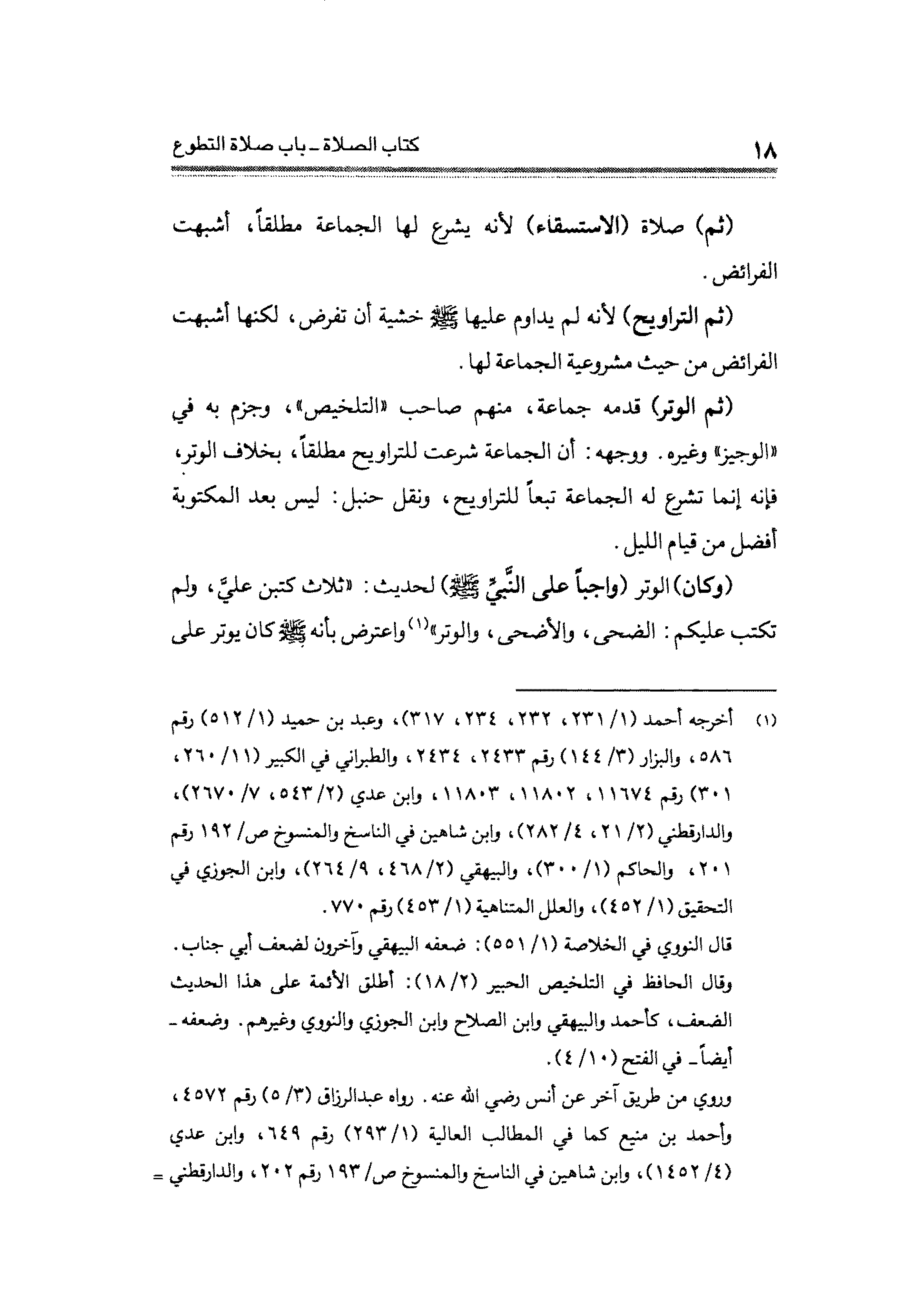 (ثم الوتر) قدمه جماعة، منهم صاحب "التلخيص"، وجزم به في "الوجيز وغيره. ووجهه: أن الجماعة شرعت للتراويح مطلقًا، بخلاف الوتر، فإنه إنما تشرع له الجماعة تبعًا للتراويح، ونقل حنبل: ليس بعد المكتوبة أفضل من قيام الليل.