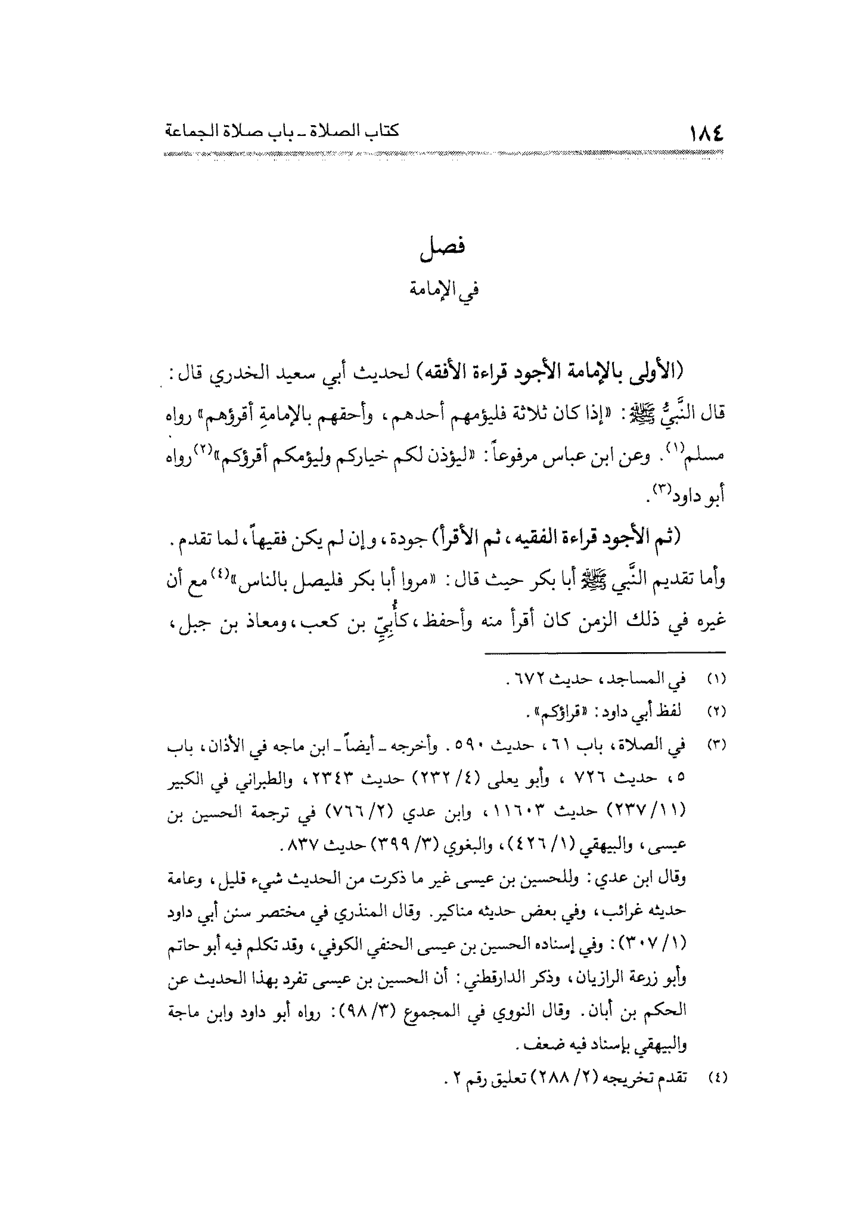 (الأولى بالإمامة الأجود قراءة الأفقه) لحديث أبي سعيد الخدري قال: قال النَّبيُّ - صلى الله عليه وسلم -:"إذا كان ثلاثة فليؤمهم أحدهم، وأحقهم بالإمامةِ أقرؤهم" رواه مسلم (¬١). وعن ابن عباس مرفوعاً: "ليؤذن لكم خياركم وليؤمكم أقرؤكم" (¬٢) رواه أبو داود (¬٣).