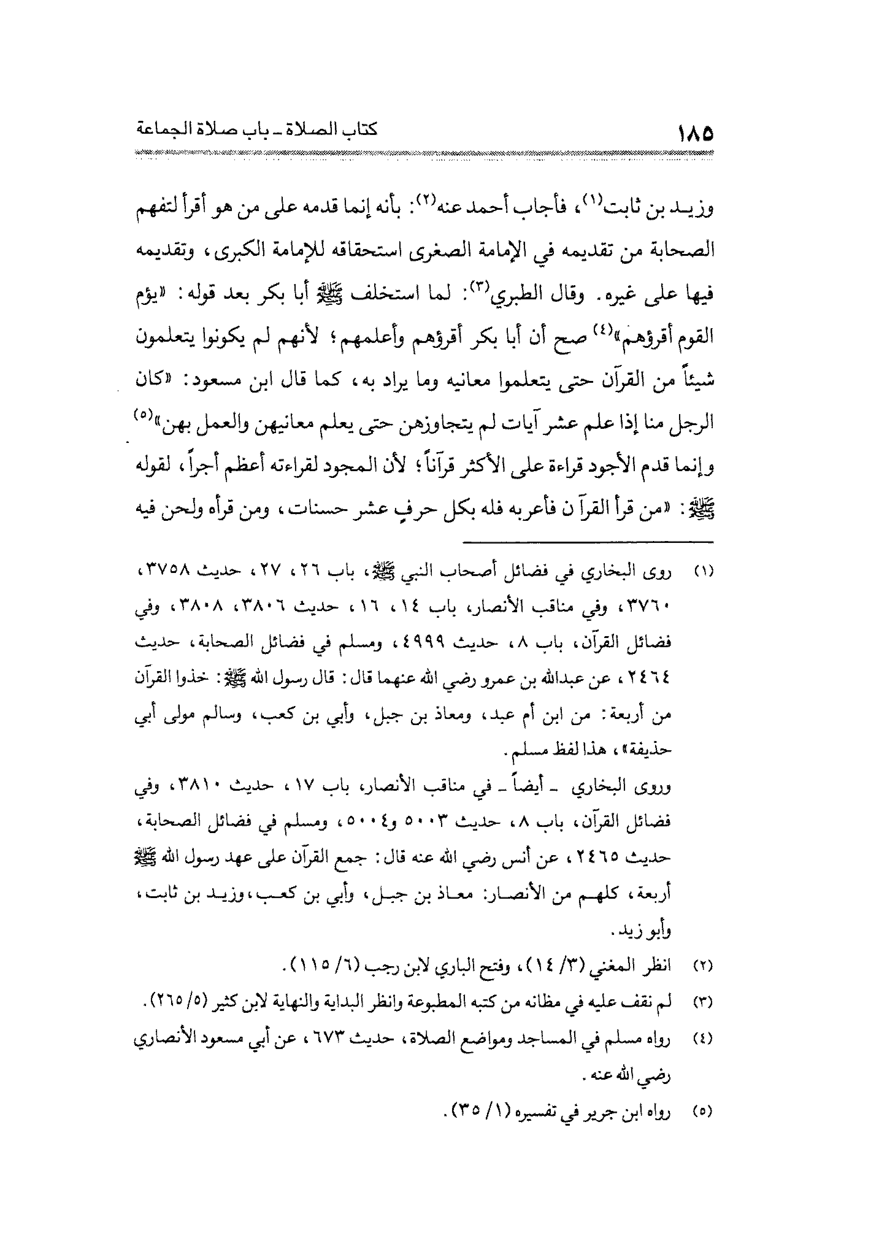 (¬١) روى البخاري في فضائل أصحاب النبي - صلى الله عليه وسلم -، باب ٢٦، ٢٧، حديث ٣٧٥٨، ٣٧٦٠، وفي مناقب الأنصار، باب ١٤، ١٦، حديث ٣٨٠٦، ٣٨٠٨، وفي فضائل القرآن، باب ٨، حديث ٤٩٩٩، ومسلم في فضائل الصحابة، حديث ٢٤٦٤، عن عبد الله بن عمرو رضي الله عنهما قال: قال رسول الله - صلى الله عليه وسلم -: "خذوا القرآن من أربعة: من ابن أم عبد، ومعاذ بن جبل، وأبي بن كعب، وسالم مولى أبي حذيفة"، هذا لفظ مسلم.