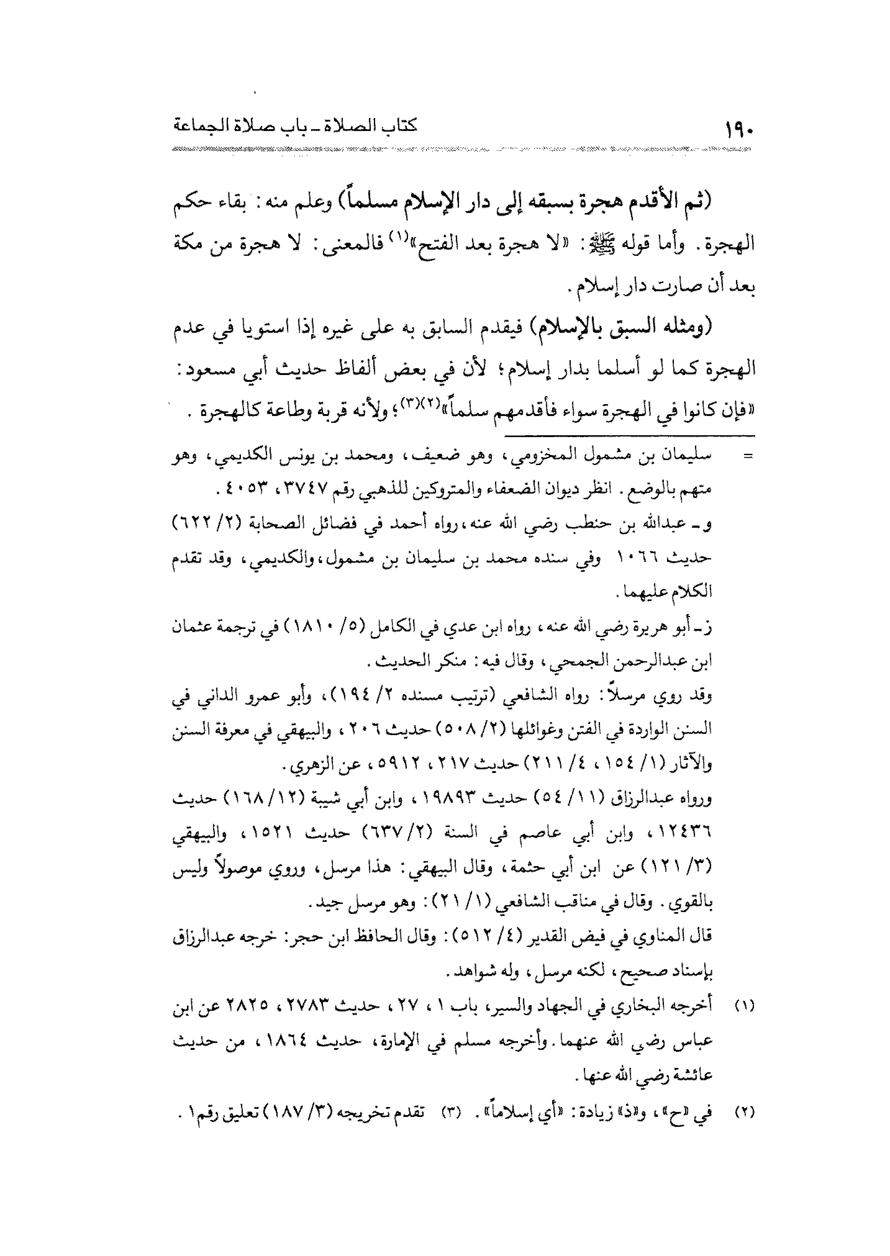 (ثم الأقدم هجرة بسبقه إلى دار الإسلام مسلماً) وعلم منه: بقاء حكم الهجرة. وأما قوله - صلى الله عليه وسلم -: "لا هجرة بعد الفتح" (¬١) فالمعنى: لا هجرة من مكة بعد أن صارت دار إسلام.