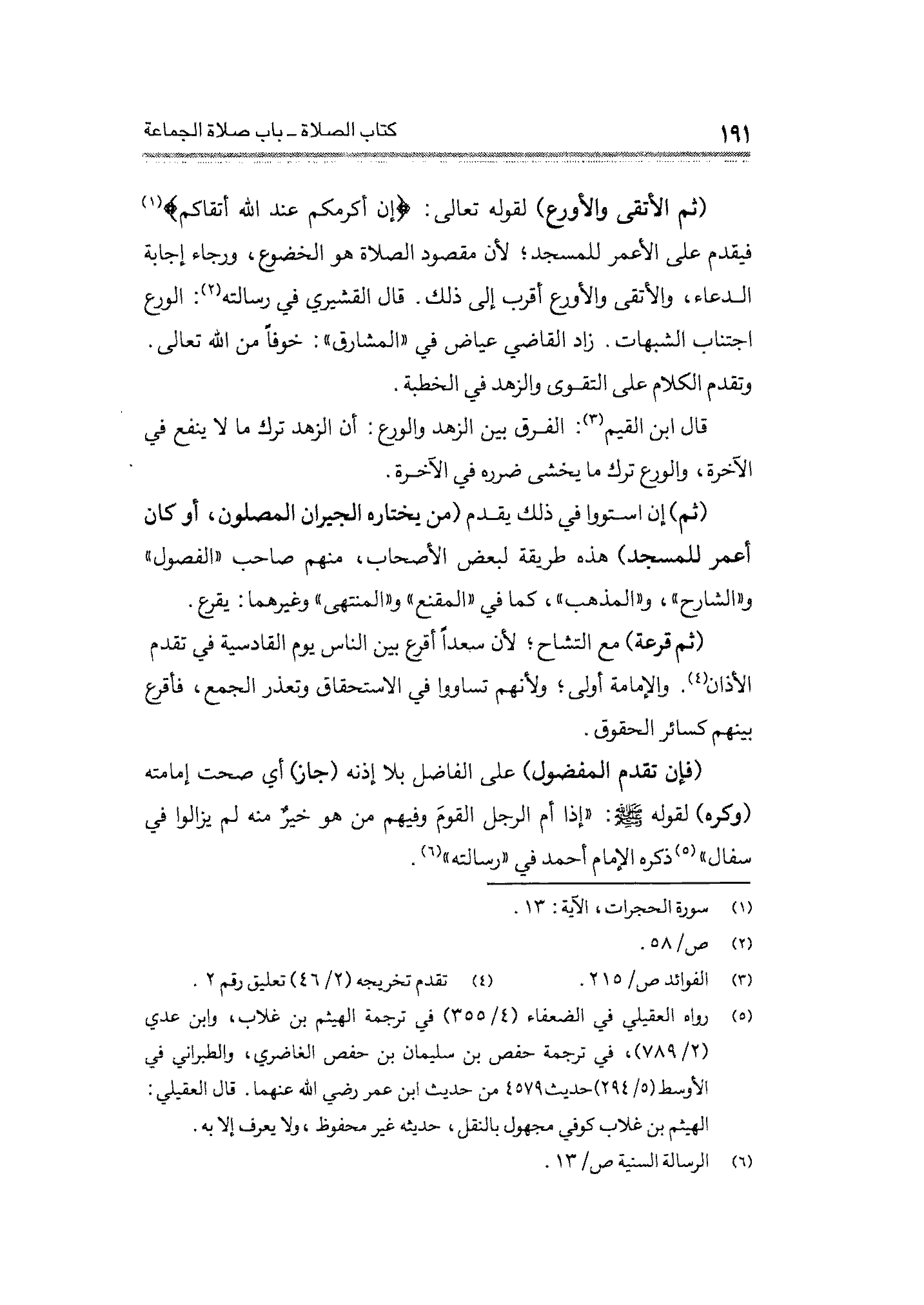 (ثم الأتقى والأورع) لقوله تعالى: {إِنَّ أَكْرَمَكُمْ عِنْدَ اللَّهِ أَتْقَاكُمْ} (¬١) فيقدم على الأعمر للمسجد؛ لأن مقصود الصلاة هو الخضوع، ورجاء إجابة الدعاء، والأتقى والأورع أقرب إلى ذلك. قال القشيري في رسالته (¬٢): الورع اجتناب الشبهات. زاد القاضي عياض في "المشارق": خوفًا من الله تعالى. وتقدم الكلام على التقوى والزهد في الخطبة.