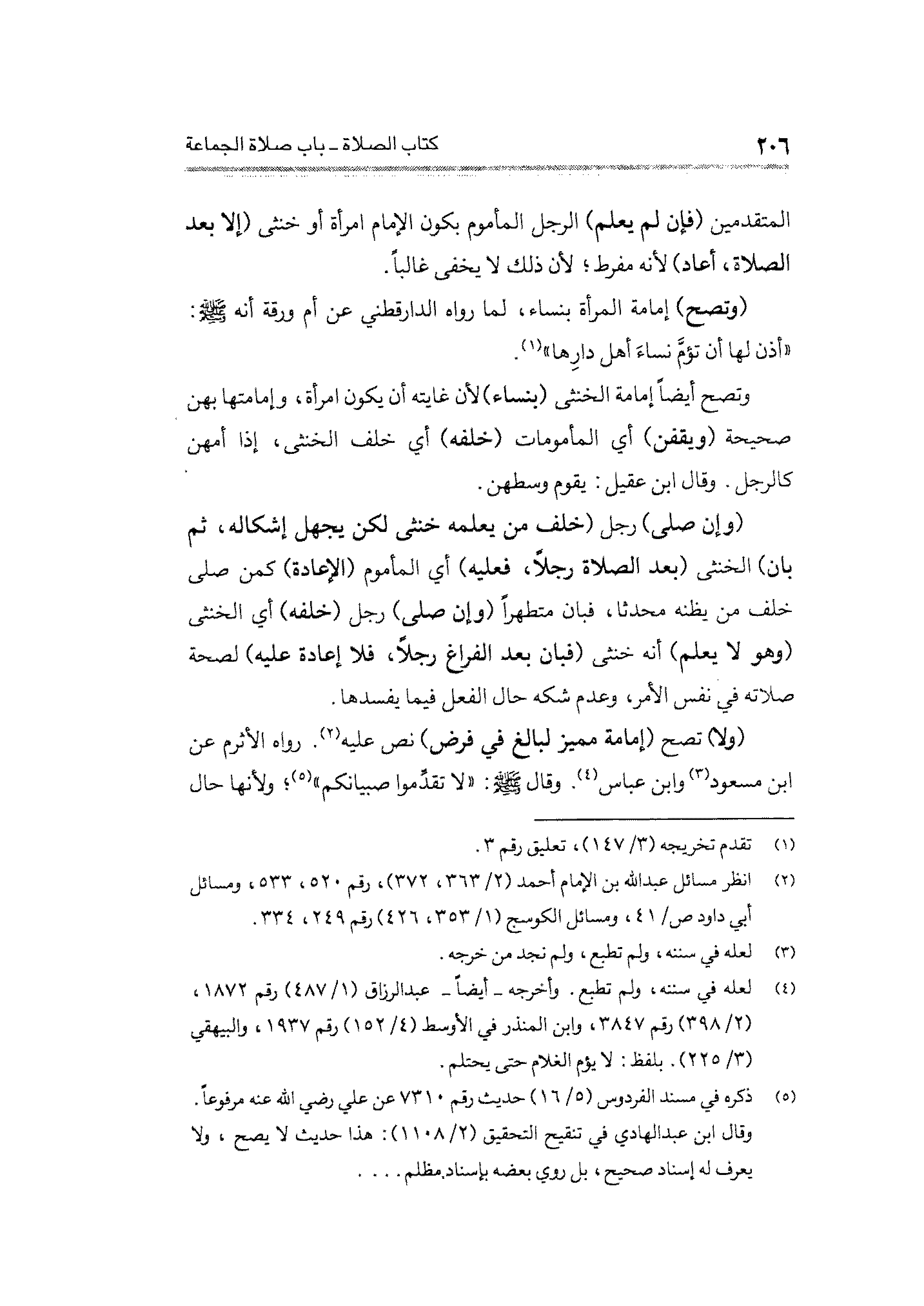 وتصح أيضًا إمامة الخنثى (بنساء) لأن غايته أن يكون امرأة، وإمامتها بهن صحيحة (ويقفن) أي المأمومات (خلفه) أي خلف الخنثى، إذا أمهن كالرجل. وقال ابن عقيل: يقوم وسطهن.