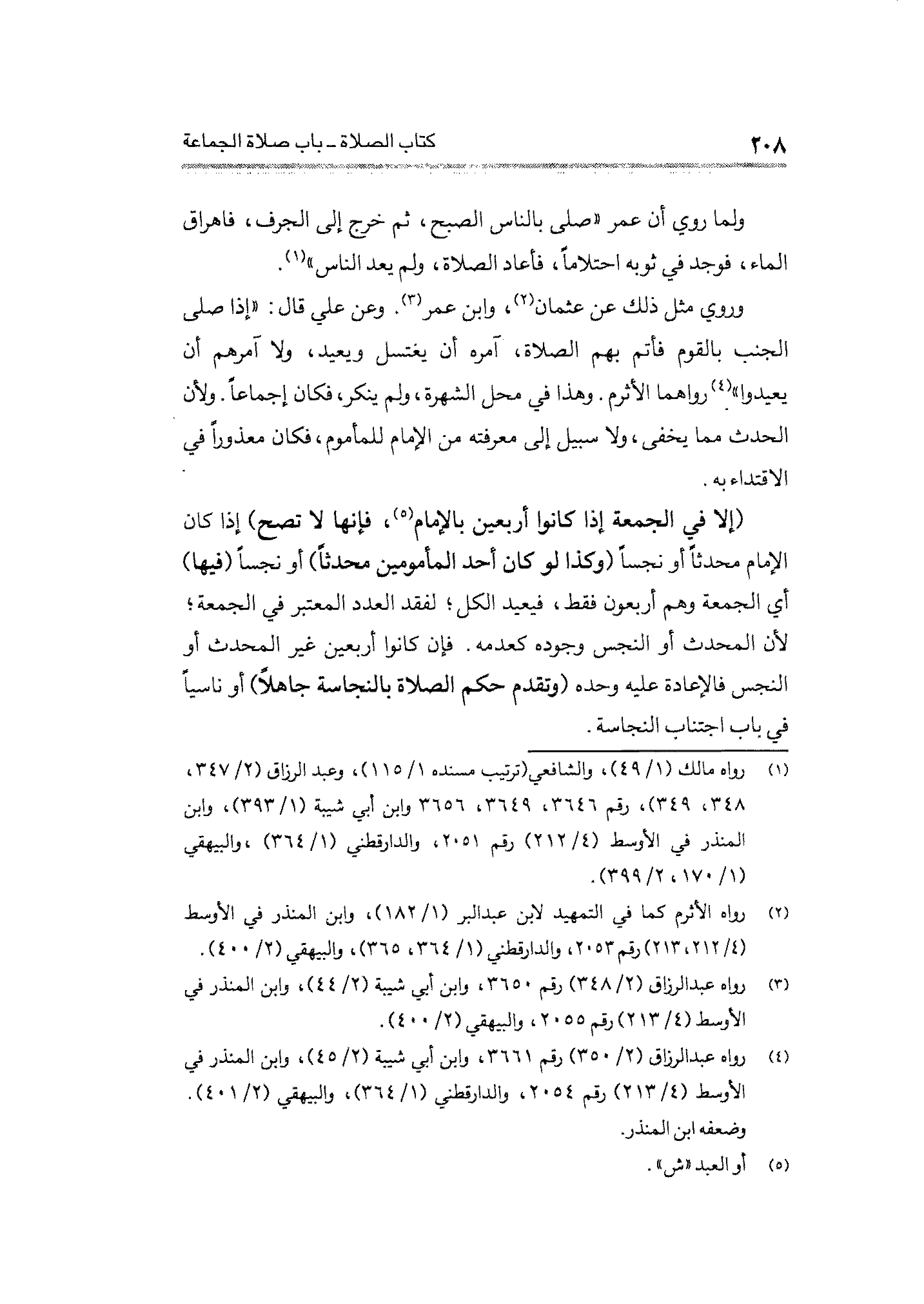 ولما روي أن عمر "صلى بالناس الصبح، ثم خرج إلى الجرف، فاهراق الماء، فوجد في ثوبه احتلامًا، فأعاد الصلاة، ولم يعد الناس" (¬١).