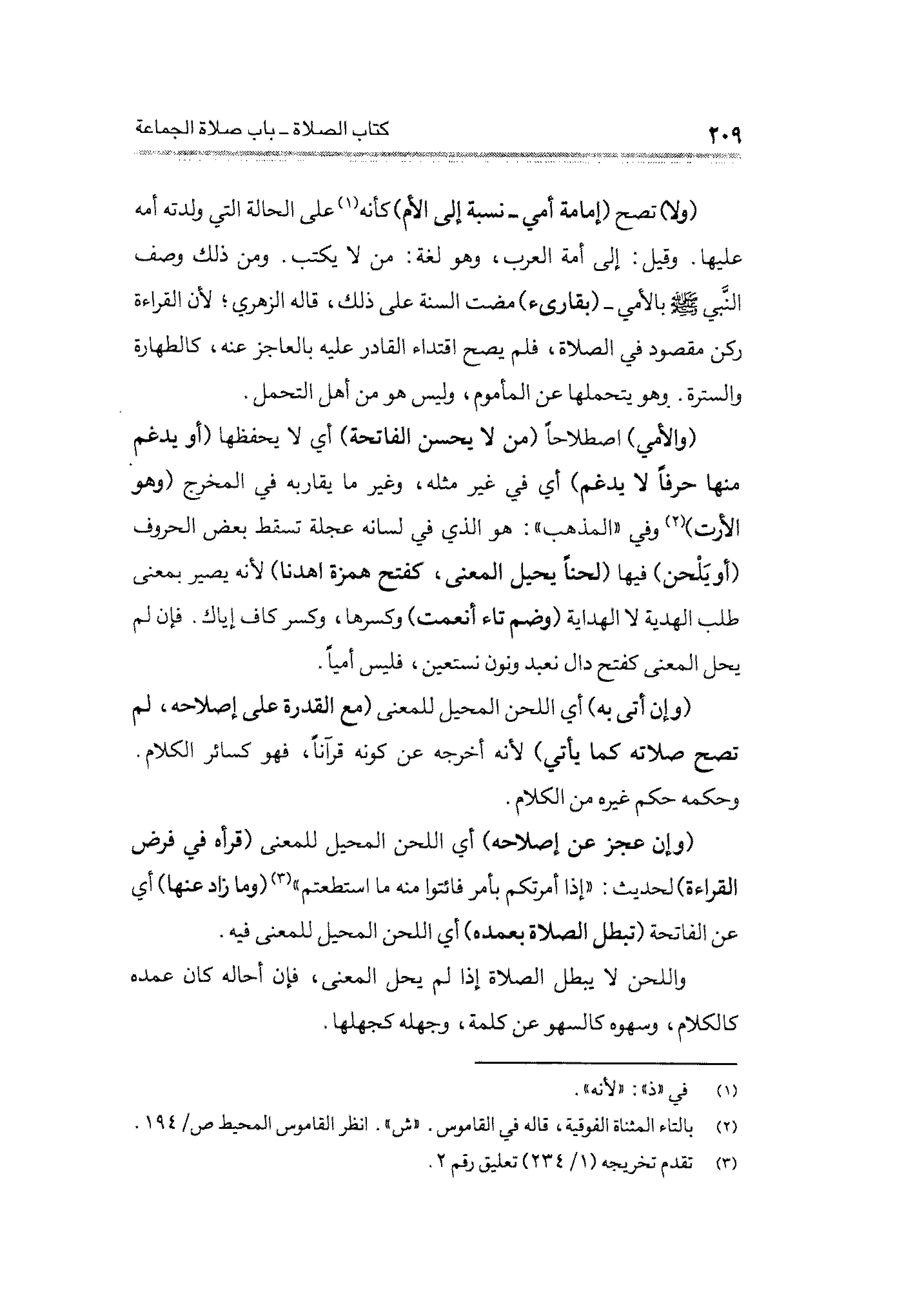 (والأمي) اصطلاحًا (من لا يحسن الفاتحة) أي لا يحفظها (أو يدغم منها حرفًا لا يدغم) أي في غير مثله، وغير ما يقاربه في المخرج (وهو الأرت) (¬٢) وفي "المذهب": هو الذي في لسانه عجلة تسقط بعض الحروف (أو يَلْحن) فيها (لحنًا يحيل المعنى، كفتح همزة اهدنا) لأنه يصير بمعنى طلب الهدية لا الهداية (وضم تاء أنعمت) وكسرها، وكسر كاف إياك. فإن لم يحل المعنى كفتح دال نعبد ونون نستعين، فليس أميًا.