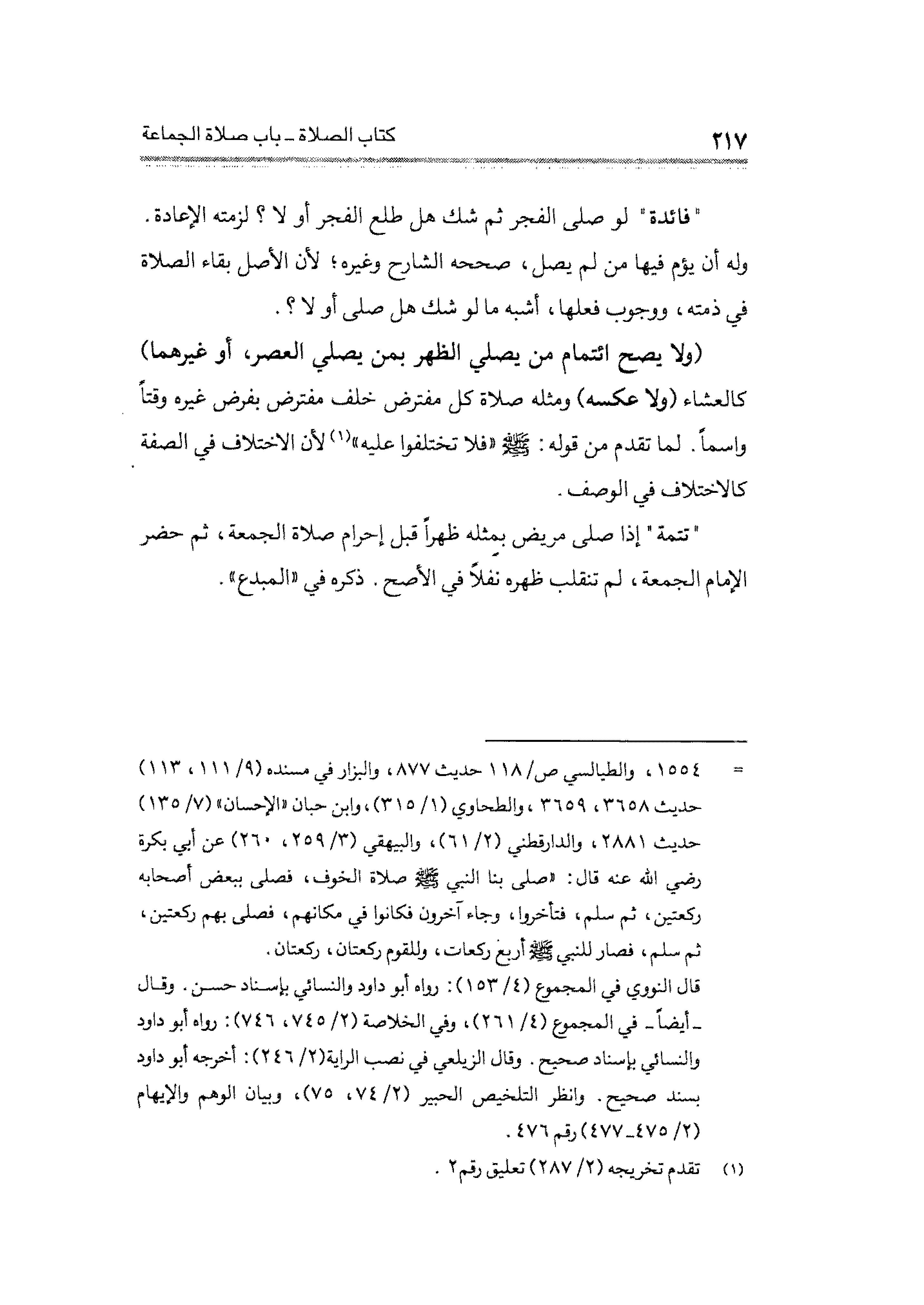 "تتمة" إذا صلى مريض بمِثله ظهراً قبل إحرام صلاة الجمعة، ثم حضر الإمام الجمعة، لم تنقلب ظهره نفلاً في الأصح. ذكره في "المبدع".