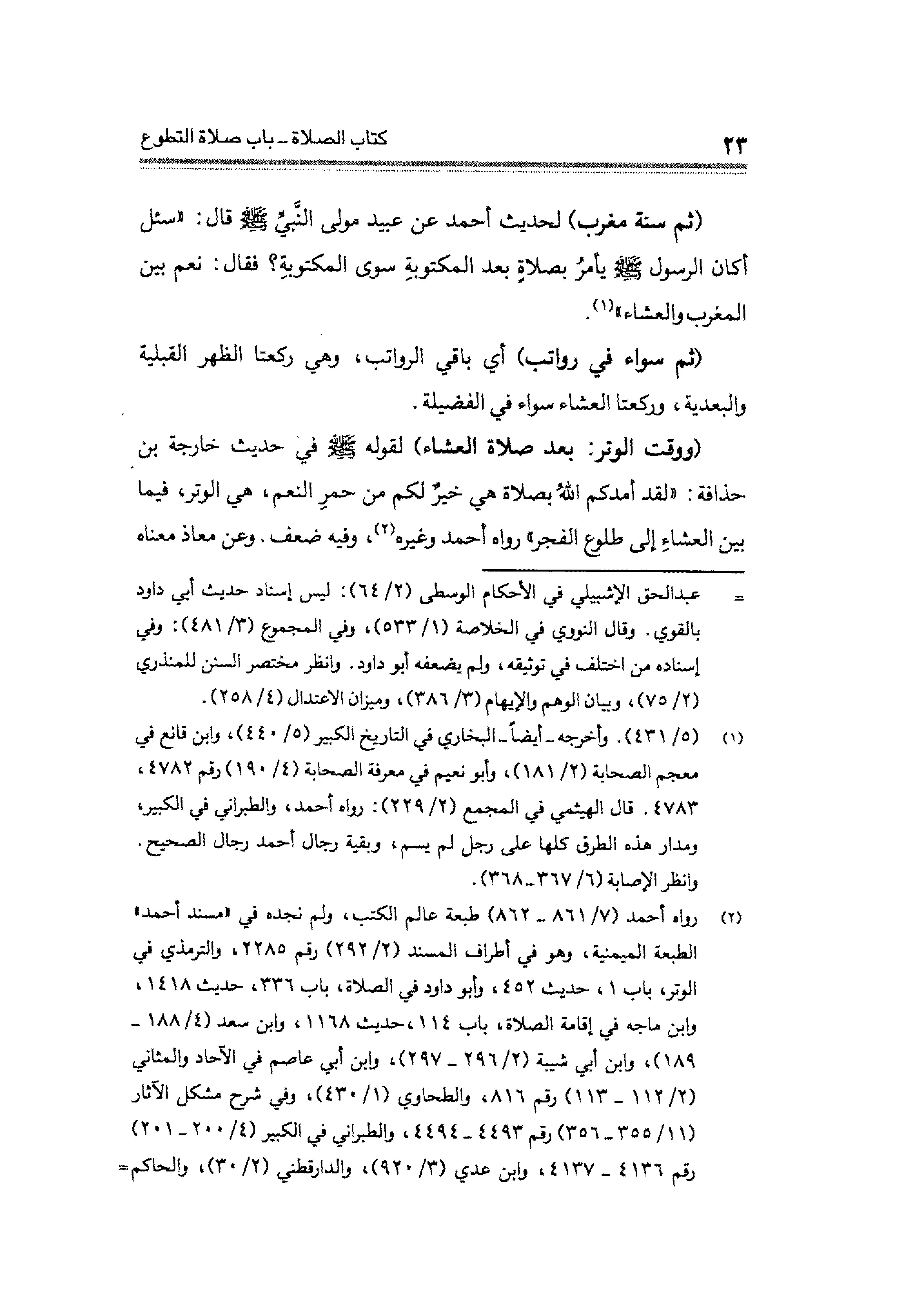 (¬٢) رواه احمد (٧/ ٨٦١ - ٨٦٢) طبعة عالم الكتب، ولم نجده في "مسند أحمد" الطبعة الميمنية، وهو في أطراف المسند (٢/ ٢٩٢) رقم ٢٢٨٥، والترمذي في الوتر، باب ١، حديث ٤٥٢، وأبو داود في الصلاة، باب ٣٣٦، حديث ١٤١٨، وابن ماجه في إقامة الصلاة باب ١١٤، حديث ١١٦٨، وابن سعد (٤/ ١٨٨ - ١٨٩)، وابن أبي شيبة (٢/ ٢٩٦ - ٨٩٧) وابن أبي عاصم في الآحاد والمثاني (٢/ ١١٢ - ١١٣) رقم ٨١٦، والطحاوي (١/ ٤٣٠)، وفي شرح مشكل الآثار (١١/ ٣٥٥ - ٣٥٦) رقم ٤٤٩٣ - ٤٤٩٤، والطبراني في الكبير (٤/ ٢٠٠ - ٢٠١) رقم ٤١٣٦ - ٤١٣٧، وابن عدي (٣/ ٩٢٠)، والدارقطني (٢/ ٣٠)، والحاكم =