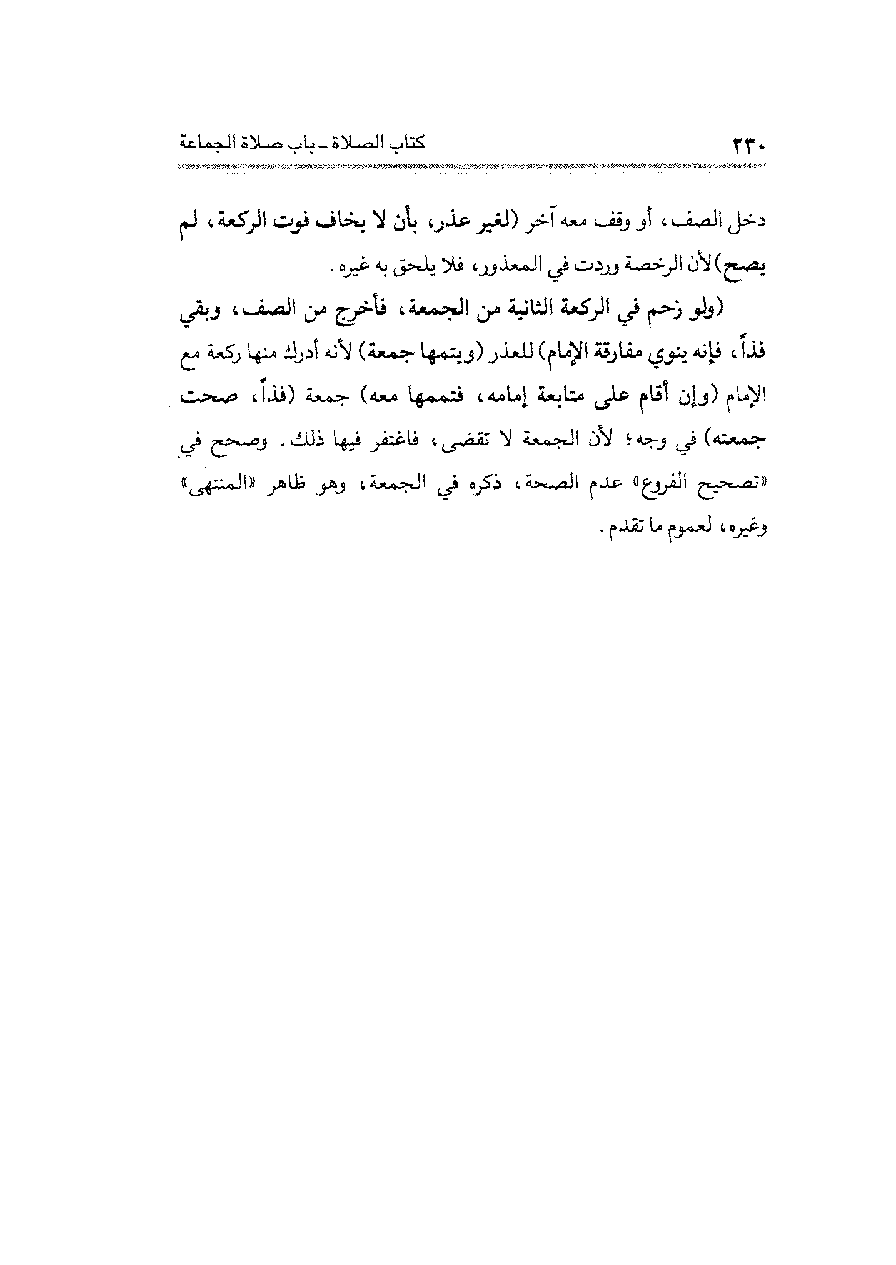 دخل الصف، أو وقف معه آخر (لغير عذر، بأن لا يخاف فوت الركعة، لم يصح) لأن الرخصة وردت في المعذور، فلا يلحق به غيره.