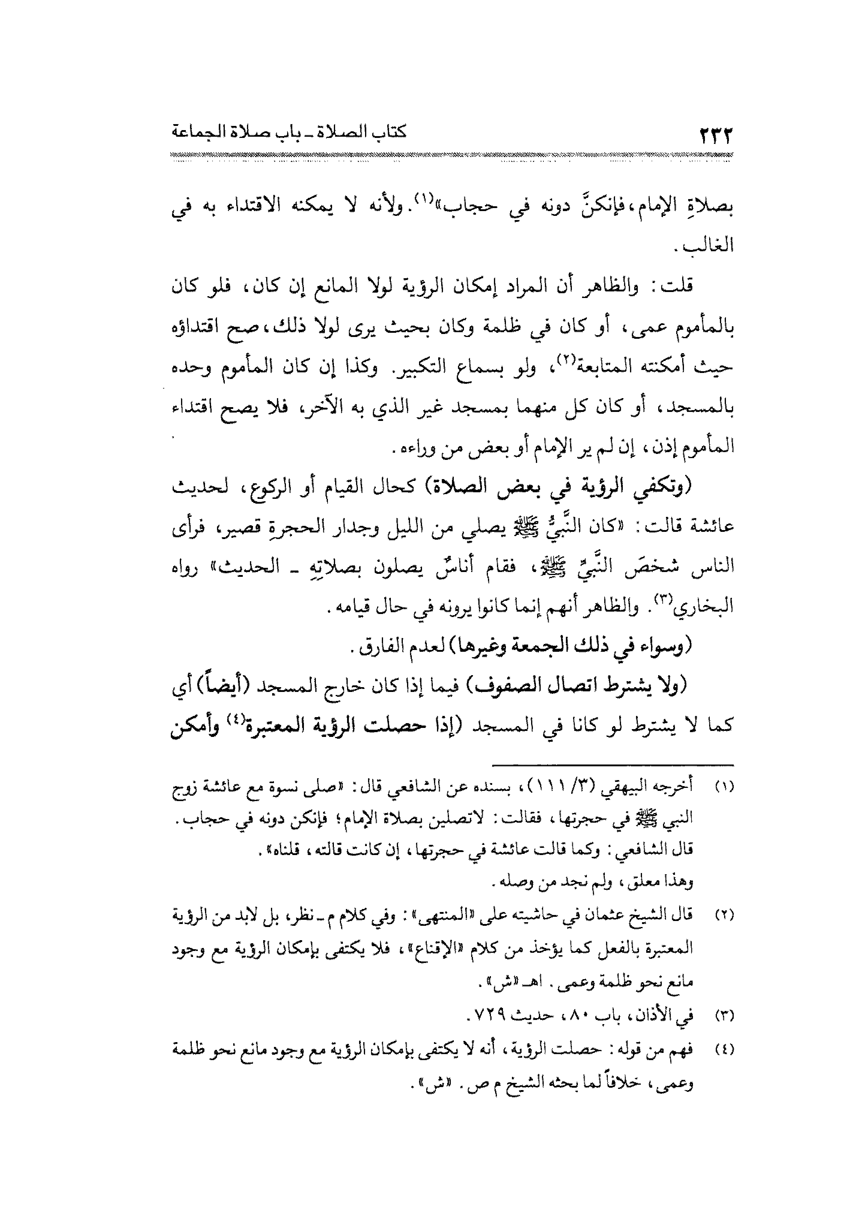 قلت: والظاهر أن المراد إمكان الرؤية لولا المانع كان، فلو كان بالمأموم عمى، أو كان في ظلمة وكان بحيث يرى لولا ذلك، صح اقتداؤه حيث أمكنته المتابعة (¬٢)، ولو بسماع التكبير. وكذا إن كان المأموم وحده بالمسجد، أو كان كل منهما بمسجد غير الذي به الآخر، فلا يصح اقتداء المأموم إذن، إن لم ير الإمام أو بعض من وراءه.