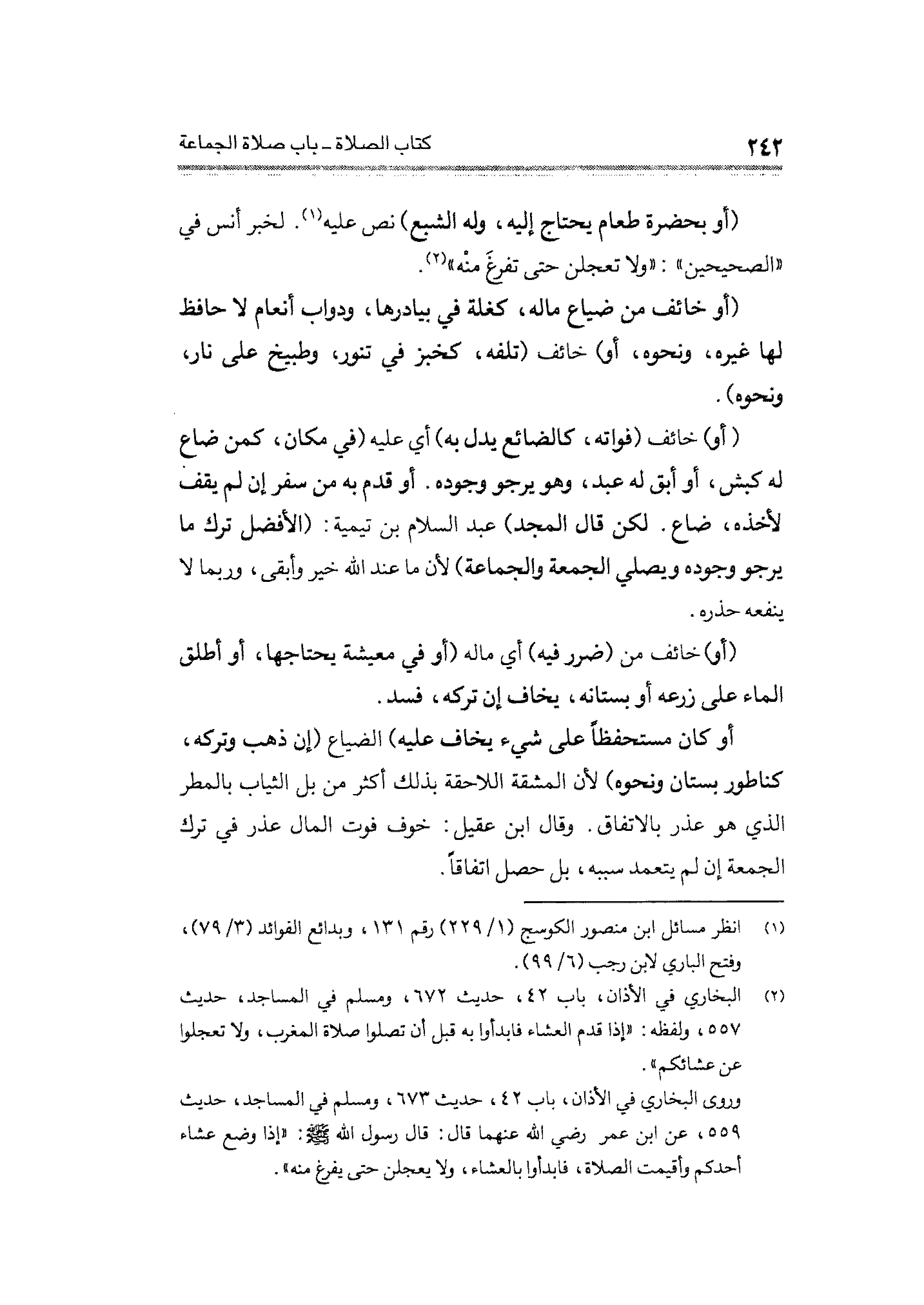 أو كان مستحفظًا على شيء يخاف عليه) الضياع (إن ذهب وتركه، كناطور بستان ونحوه) لأن المشقة اللاحقة بذلك أكثر من بل الثياب بالمطر الذي هو عذر بالاتفاق. وقال ابن عقيل: خوف فوت المال عذر في ترك الجمعة إن لم يتعمد سببه، بل حصل اتفاقًا.