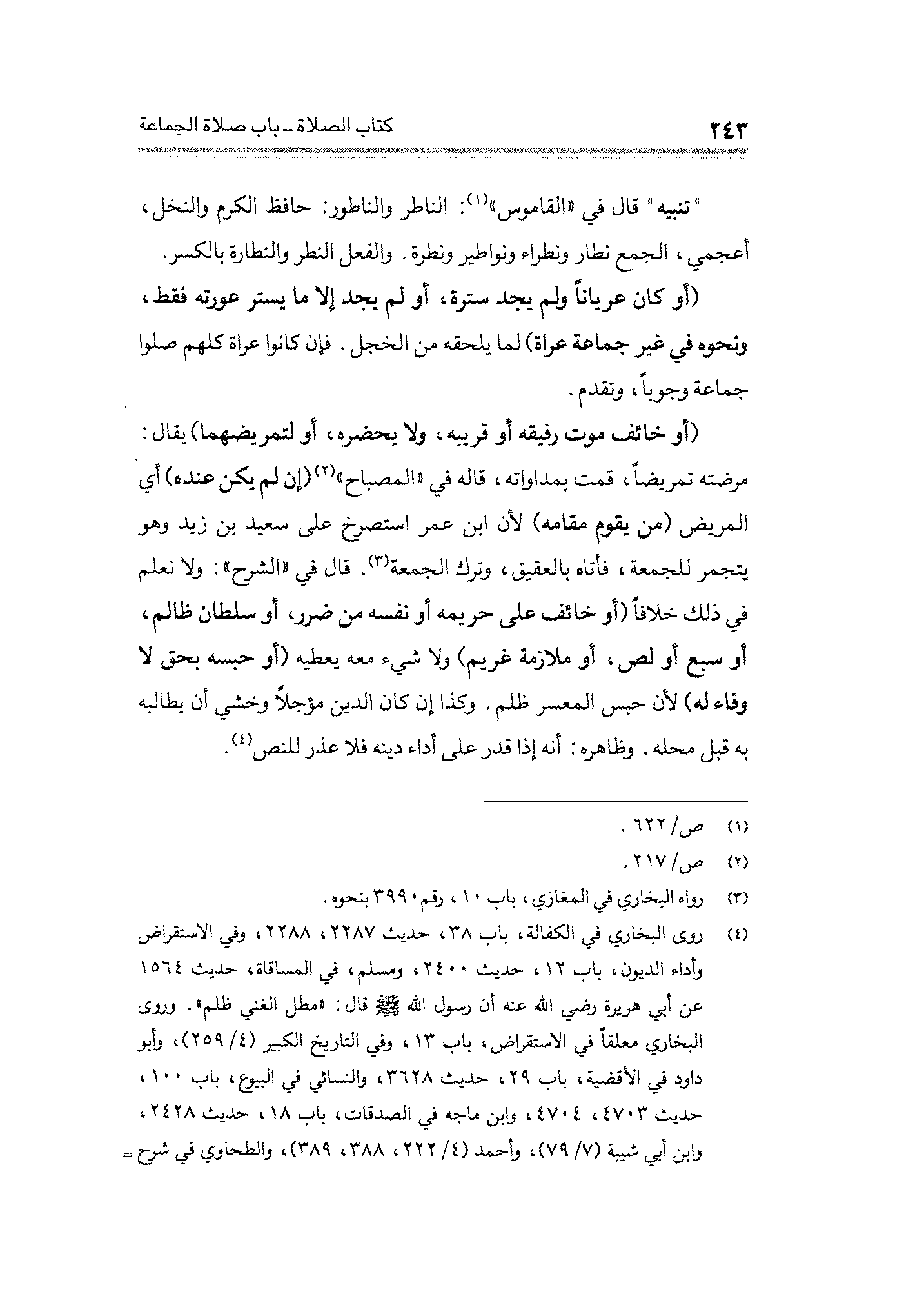 (أو خائف موت رفيقه أو قريبه، ولا يحضره، أو لتمريضهما) يقال: مرضته تمريضًا، قمت بمداواته، قاله في "المصباح" (¬٢) (إن لم يكن عنده) أي المريض (من يقوم مقامه) لأن ابن عمر استصرخ على سعيد بن زيد وهو يتجمر للجمعة، فأتاه بالعقيق، وترك الجمعة (¬٣). قال في "الشرح": ولا نعلم في ذلك خلافًا (أو خائف على حريمه أو نفسه من ضرر، أو سلطان ظالم، أو سبع أو لص، أو ملازمة غريم) ولا شيء معه يعطيه (أو حبسه يحق لا وفاء له) لأن حبس المعسر ظلم. وكذا إن كان الدين مؤجلًا وخشي أن يطالبه به قبل محله. وظاهره: أنه إذا قدر على أداء دينه فلا عذر للنص (¬٤).