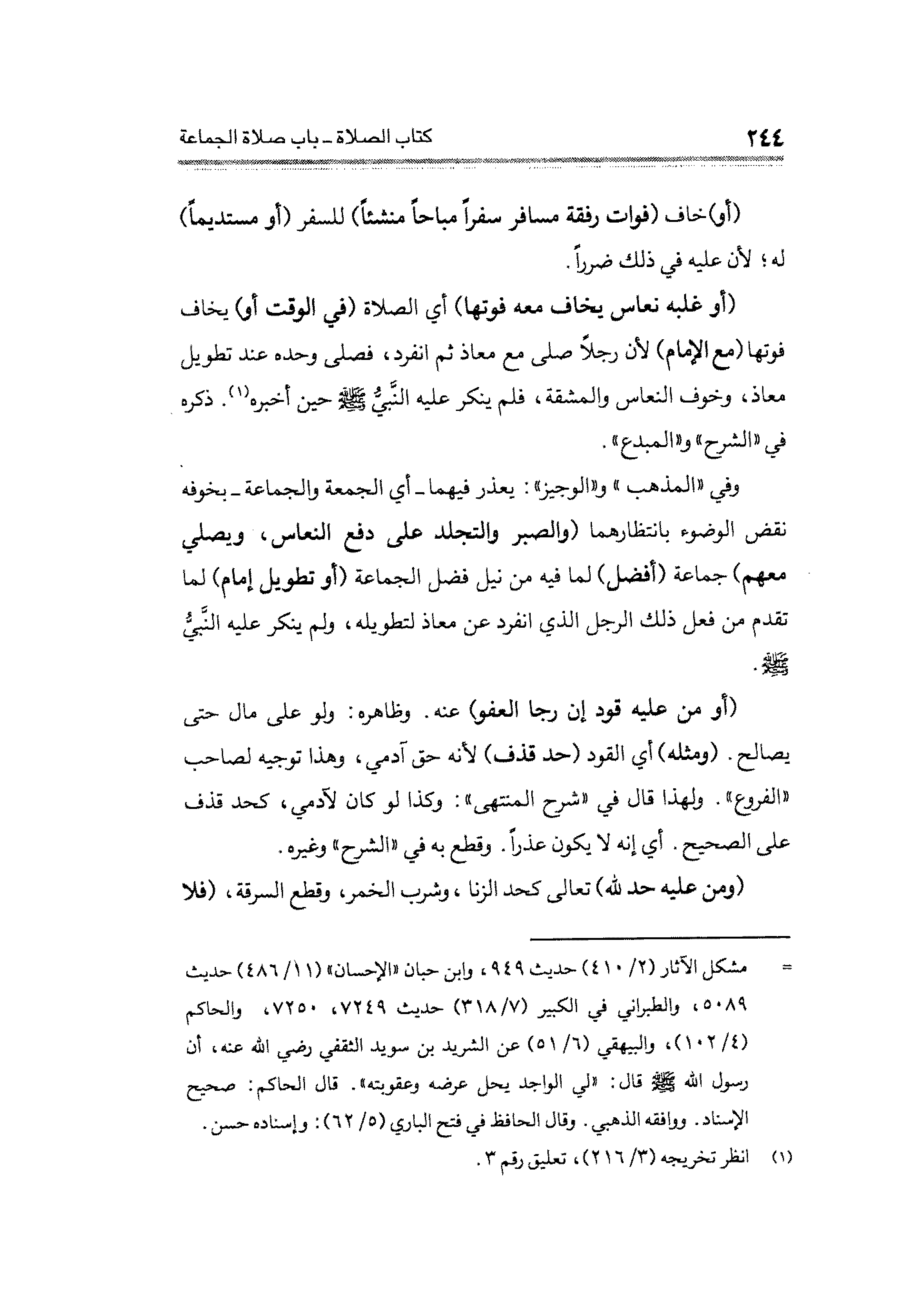 وفي "المذهب" و"الوجيز": يعذر فيهم -أي الجمعة والجماعة- بخوفه نقض الوضوء بانتظارهما (والصبر والتجلد على دفع النعاس، ويصلي معهم) جماعة (أفضل) لما فيه من نيل فضل الجماعة (أو تطويل إمام) لما تقدم من فعل ذلك الرجل الذي انفرد عن معاذ لتطويله، ولم ينكر عليه النَّبيُّ - صلى الله عليه وسلم -.