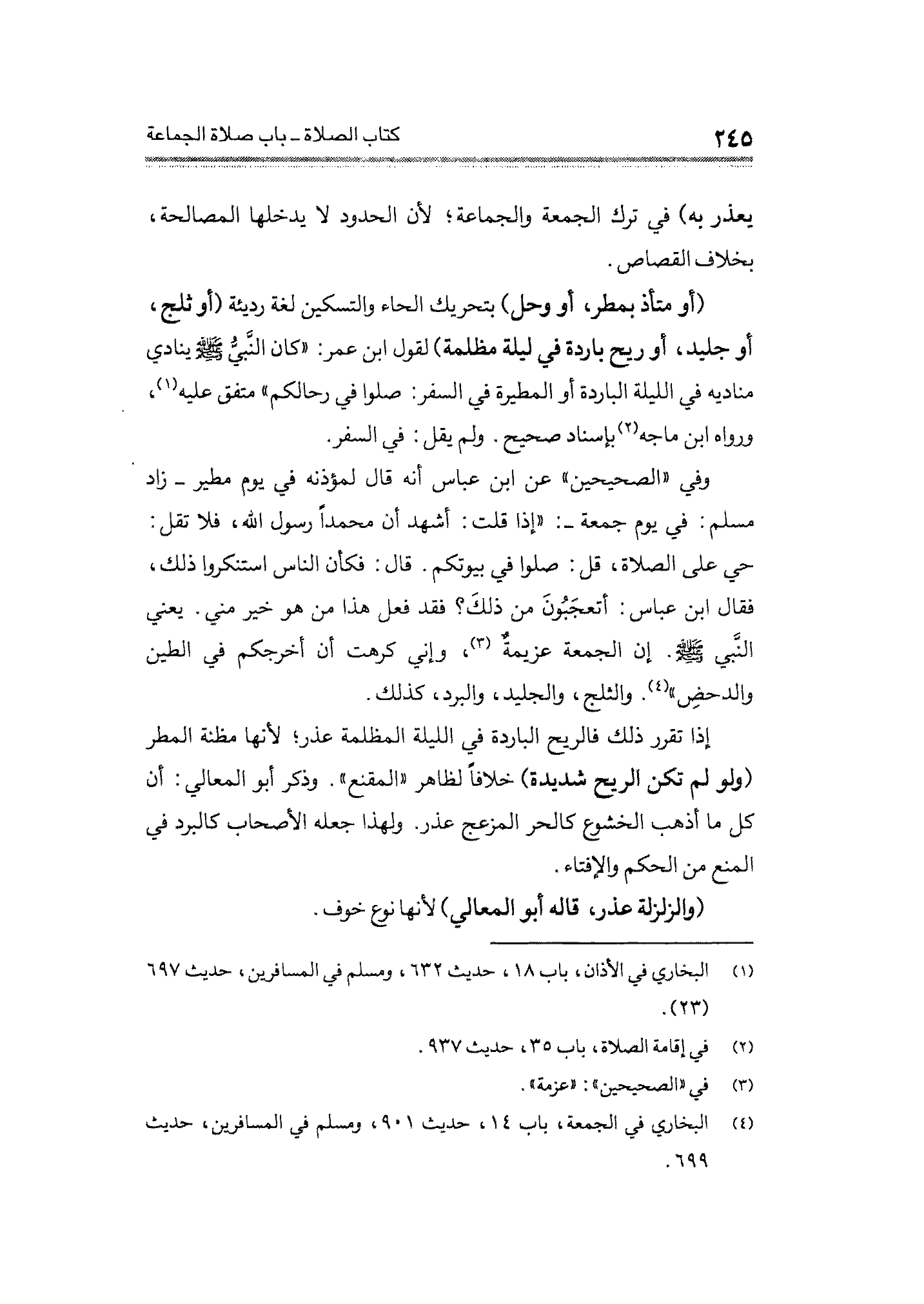 (أو متأذ بمطر، أو وحل) بتحريك الحاء والتسكين لغة رديئة (أو ثلج، أو جليد، أو ريح باردة في ليلة مظلمة) لقول ابن عمر: "كان النَّبيُّ - صلى الله عليه وسلم - ينادي مناديه في الليلة الباردة أو المطيرة في السفر: صلوا في رحالكم" متفق عليه (¬١)، ورواه ابن ماجه (¬٢) بإسناد صحيح. ولم يقل: في السفر.