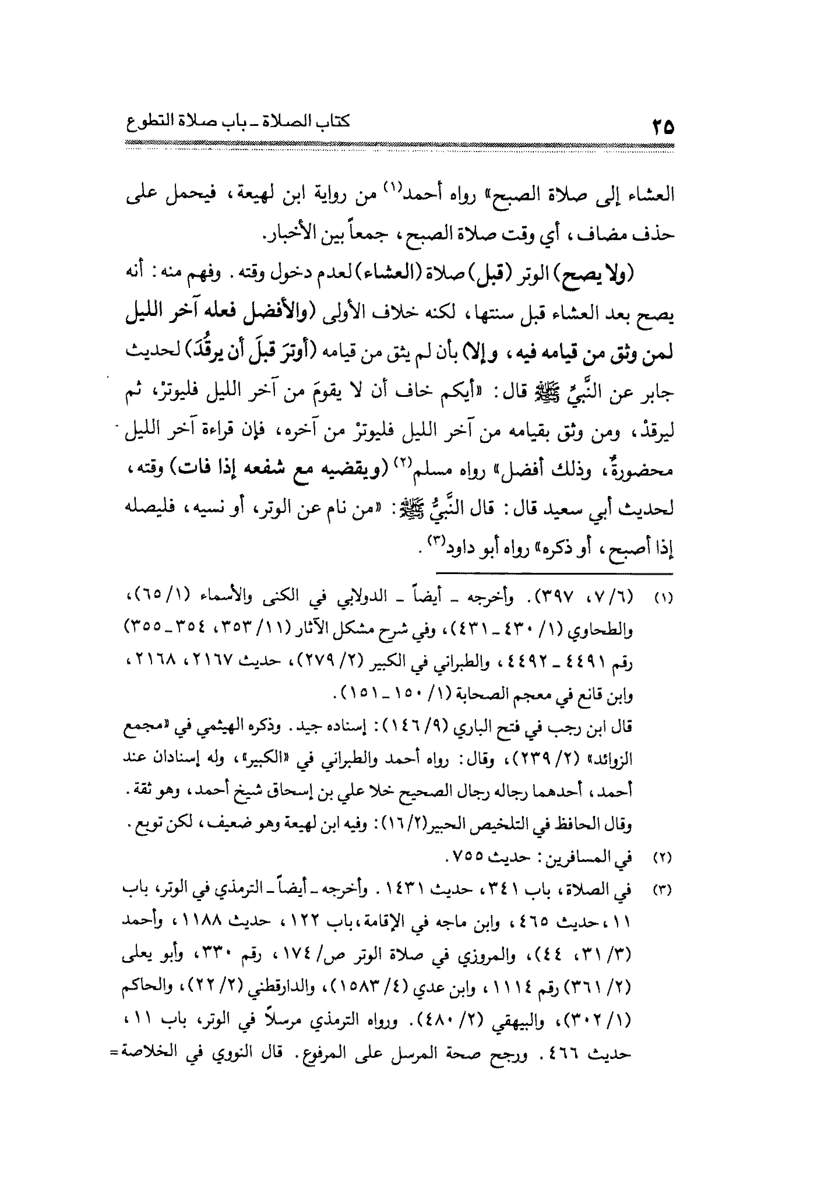 وأخرجه -أيضًا- الترمذي فى الوتر، باب ١١، حديث ٤٦٥، وابن ماجه في الإقامة، باب ١٢٢، حديث ١١٨٨، وأحمد (٣/ ٣١، ٤٤)، والمروزي في صلاة الوتر ص/١٧٤، رقم ٣٣٠، وأبو يعلى (٢/ ٣٦١) رقم ١١١٤، وابن عدي (٤/ ١٥٨٣)، والدارقطني (٢/ ٢٢)، والحاكم (١/ ٣٠٢)، والبيهقي (٢/ ٤٨٠). رواه الترمذي مرسلًا فى الوتر، باب ١١، حديث ٤٦٦. ورجح صحة المرسل على المرفوع. قال النووى في الخلاصة=