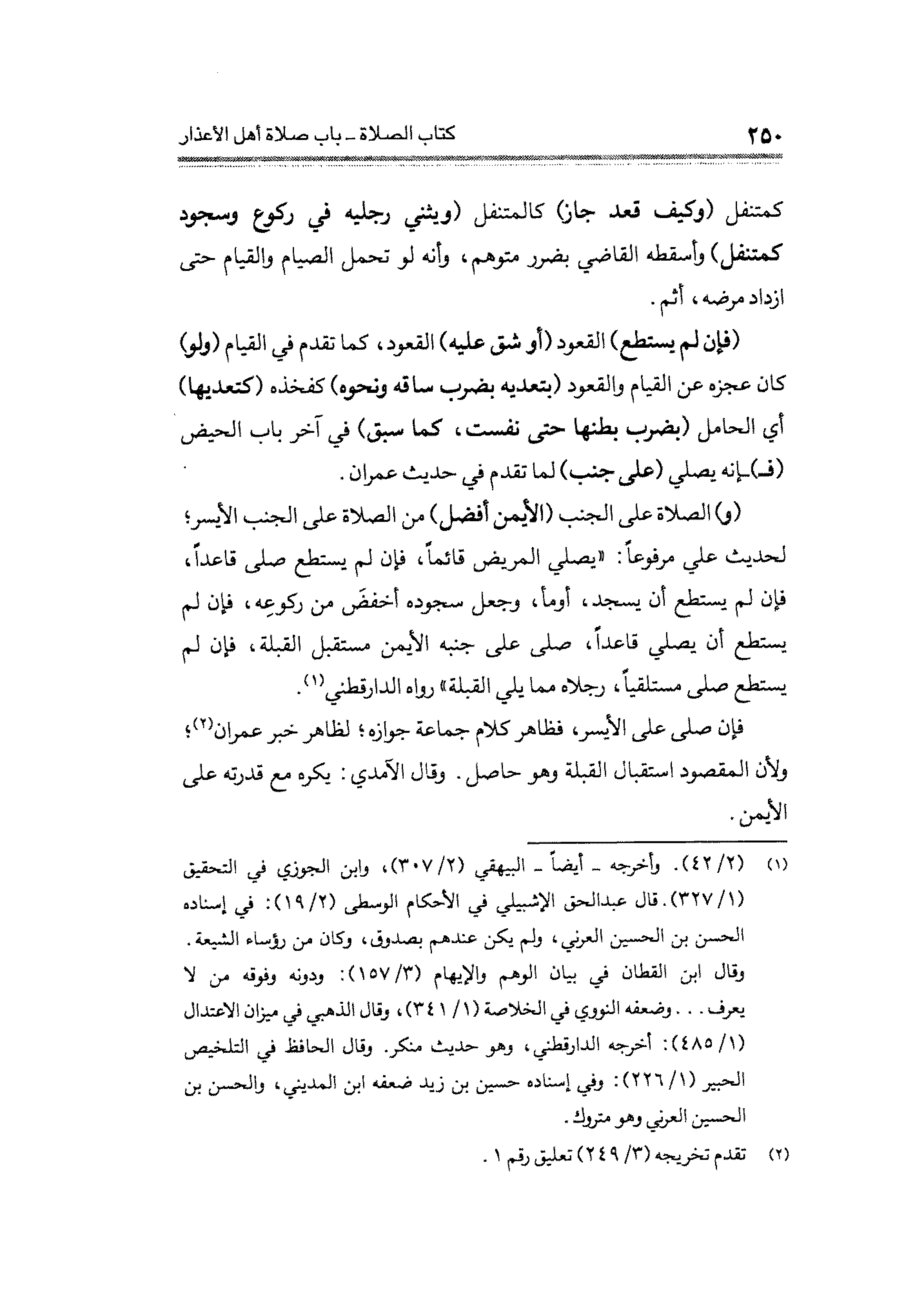 (و) الصلاة على الجنب (الأيمن أفضل) من الصلاة على الجنب الأيسر؛ لحديث علي مرفوعًا: "يصلي المريض قائمًا، فإن لم يستطع صلى قاعدًا، فإن لم يستطع أن يسجد، أومأ، وجعل سجوده أخفضَ من ركوعِه، فإن لم يستطع أن يصلي قاعدًا، صلى على جنبه الأيمن مستقبل القبلة، فإن لم يستطع أن يصلى مستلقيًا، رجلاه مما يلي القبلة" رواه الدارقطني (¬١).