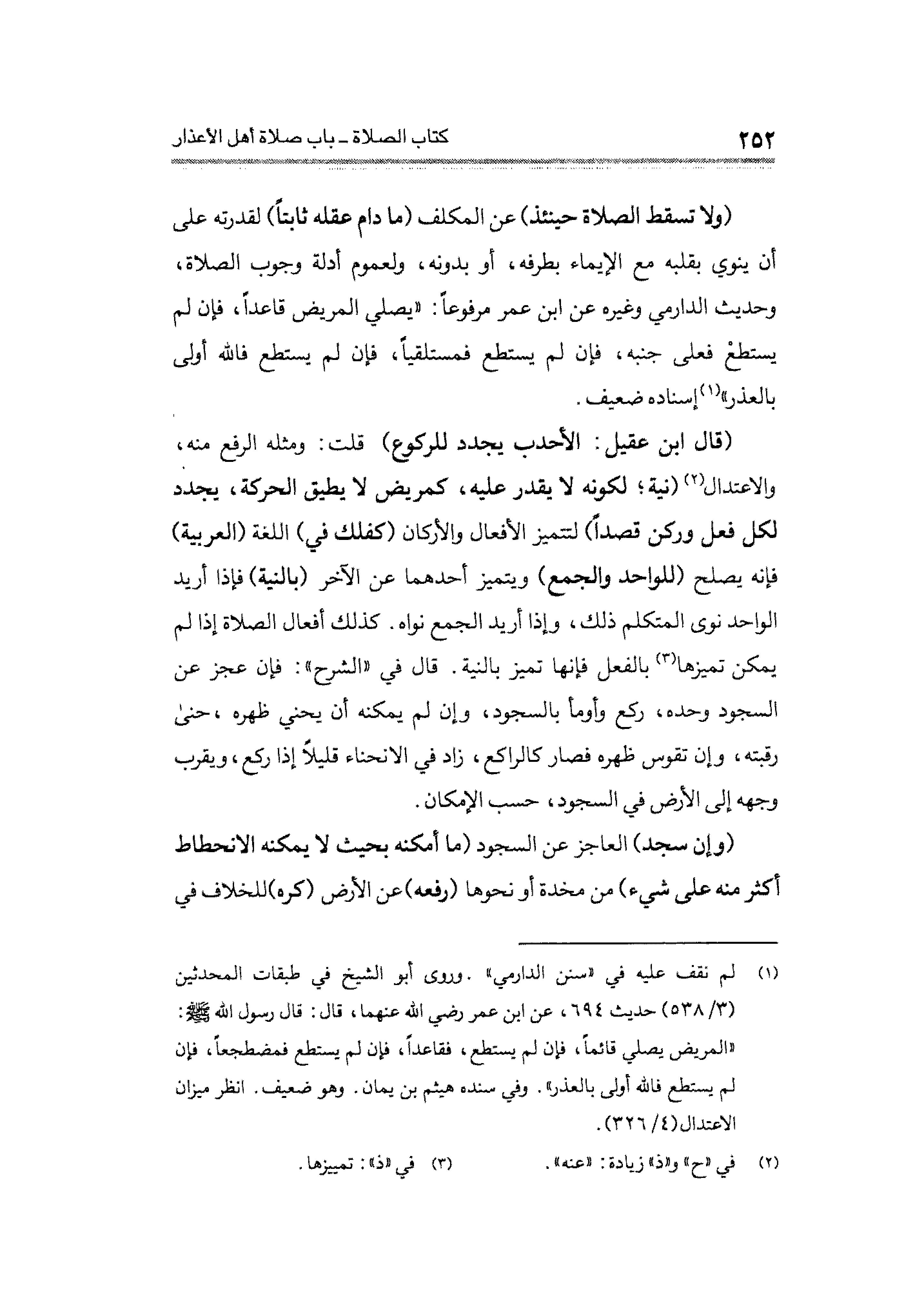 (قال ابن عقيل: الأحدب يجدد للركوع) قلت: ومثله الرفع منه، والاعتدال (¬٢) (نية؛ لكونه لا يقدر عليه، كمريض لا يطيق الحركة، يجدد لكل فعل وركن قصدًا) لتتميز الأفعال والأركان (كفلك في) اللغة (العربية) فإنه يصلح (للواحد والجمع) ويتميز أحدهما عن الآخر (بالنية) فإذا أريد الواحد نوى المتكلم ذلك، وإذا أريد الجمع نواه. كذلك أفعال الصلاة إذا لم يمكن تميزها (¬٣) بالفعل فإنها تميز بالنية. قال في "الشرح": فإن عجز عن السجود وحده، ركع وأومأ بالسجود، وإن لم يمكنه أن يحني ظهره، حنى رقبته، وإن تقوس ظهره فصار كالراكع، زاد في الانحناء قليلًا إذا ركع، ويقرب وجهه إلى الأرض في السجود، حسب الإمكان.