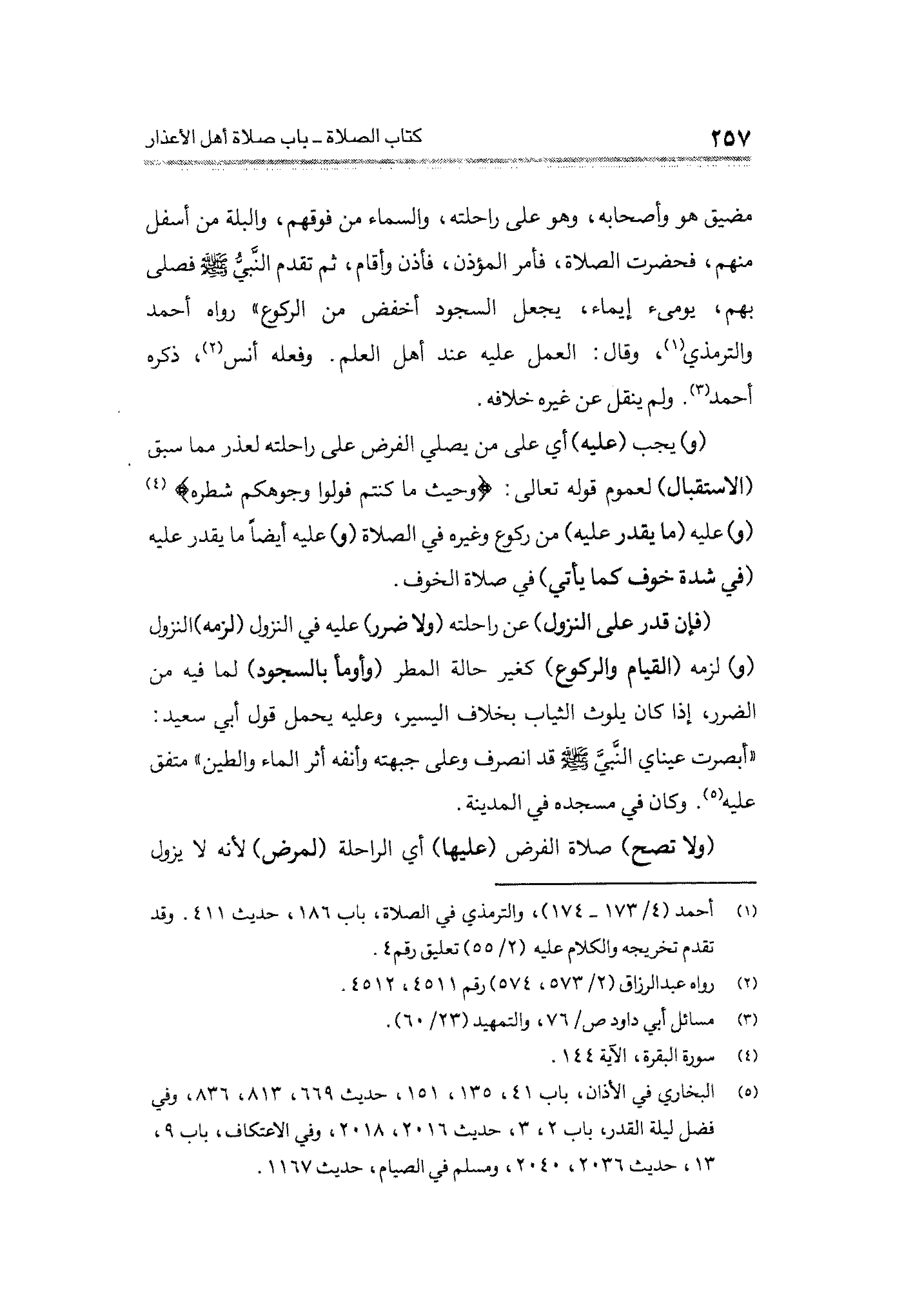 (و) يجب (عليه) أي على من يصلي الفرض على راحلته لعذر مما سبق (الاستقبال) لعموم قوله تعالى: {وحيث ما كنتم فولوا وجوهكم شطره} (¬٤) (و) عليه (ما يقدر عليه) من ركوع وغيره في الصلاة (و) عليه أيضًا ما يقدر عليه (في شدة خوف كما يأتي) في صلاة الخوف.