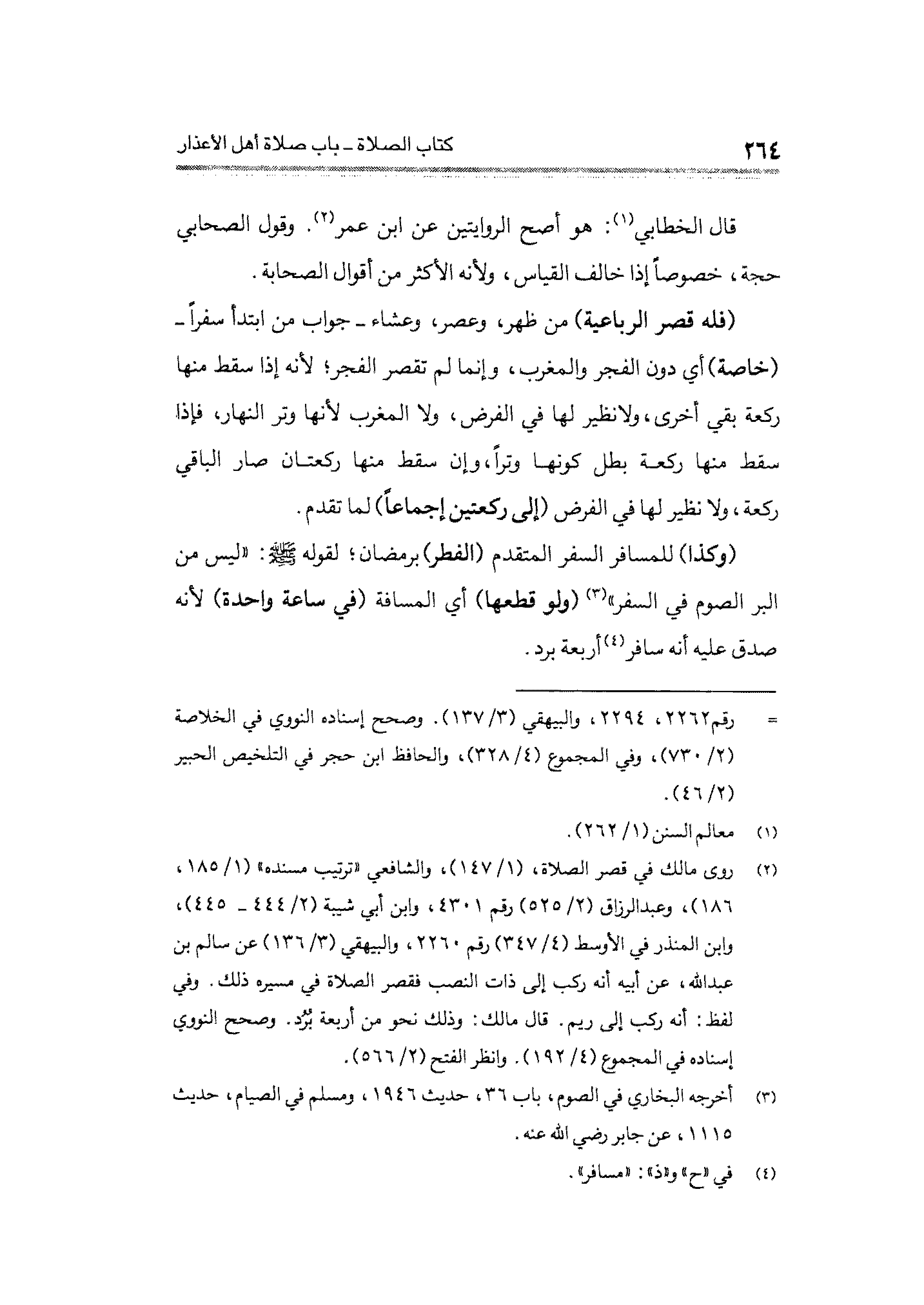 (¬٢) روى مالك في قصر الصلاة، (١/ ١٤٧)، والشافعي "ترتيب مسنده" (١/ ١٨٥، ١٨٦)، وعبد الرزاق (٢/ ٥٢٥) رقم ٤٣٠١، وابن أبي شيبة (٢/ ٤٤٤ - ٤٤٥)، وابن المنذر في الأوسط (٤/ ٣٤٧) رقم ٢٢٦٠، والبيهقي (٣/ ١٣٦) عن سالم بن عبد الله، عن أبيه أنه ركب إلى ذات النصب فقصر الصلاة في مسيره ذلك. وفي لفظ: أنه ركب إلى ريم. قال مالك: وذلك نحو من أربعة برد. وصحيح النووي إسناده في المجموع (٤/ ١٩٢). وانظر الفتح (٢/ ٥٦٦).