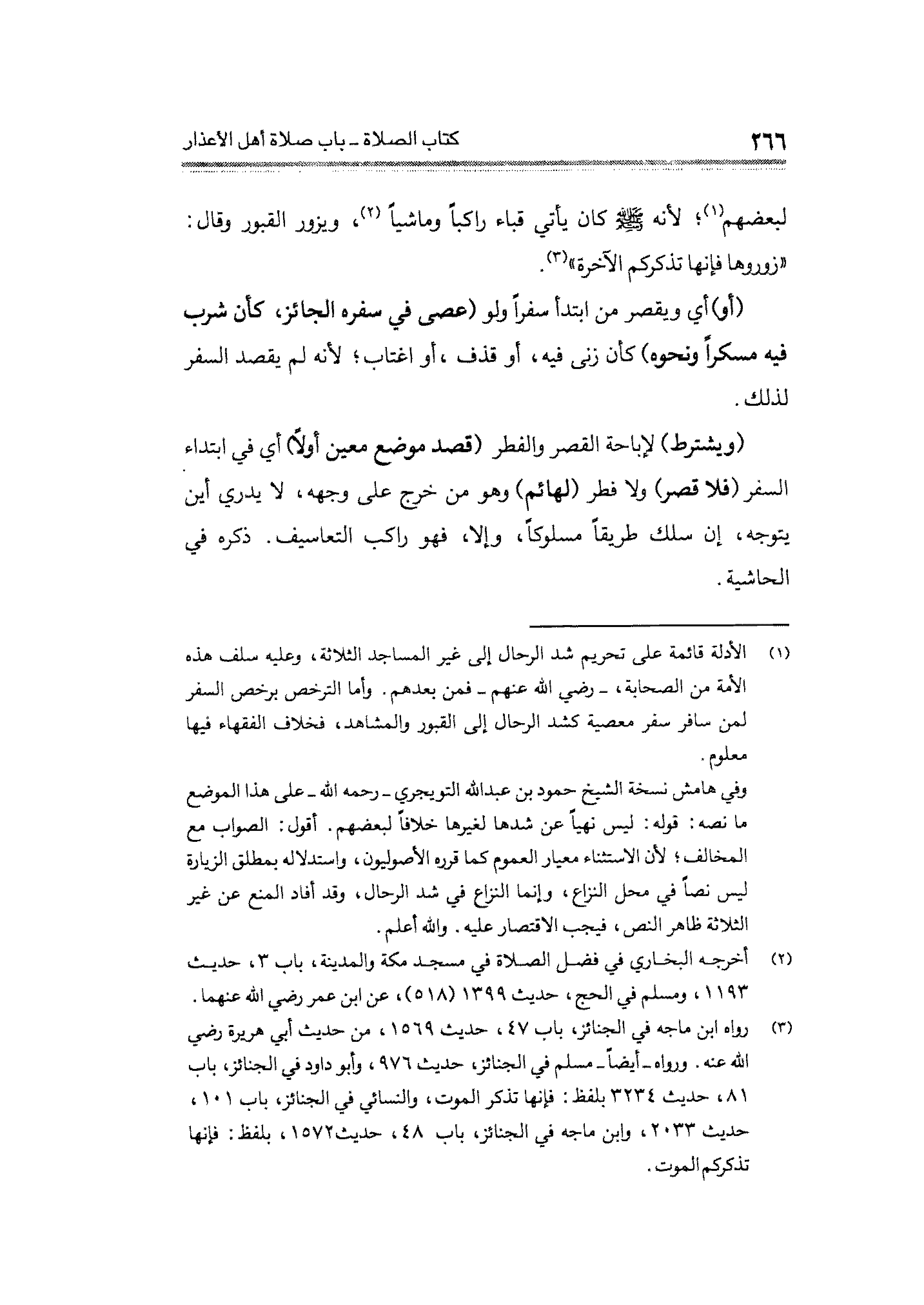 (¬١) الأدلة قائمة على تحريم شد الرحال إلى غير المساجد الثلاثة، وعليه سلف هذه الأمة عن الصحابة، -رضي الله عنهم- فمن بعدهم. وأما الترخص برخص السفر لمن سافر سفر معصية كشد الرحال إلى القبور والمشاهد، فخلاف الفقهاء فيها معلوم.