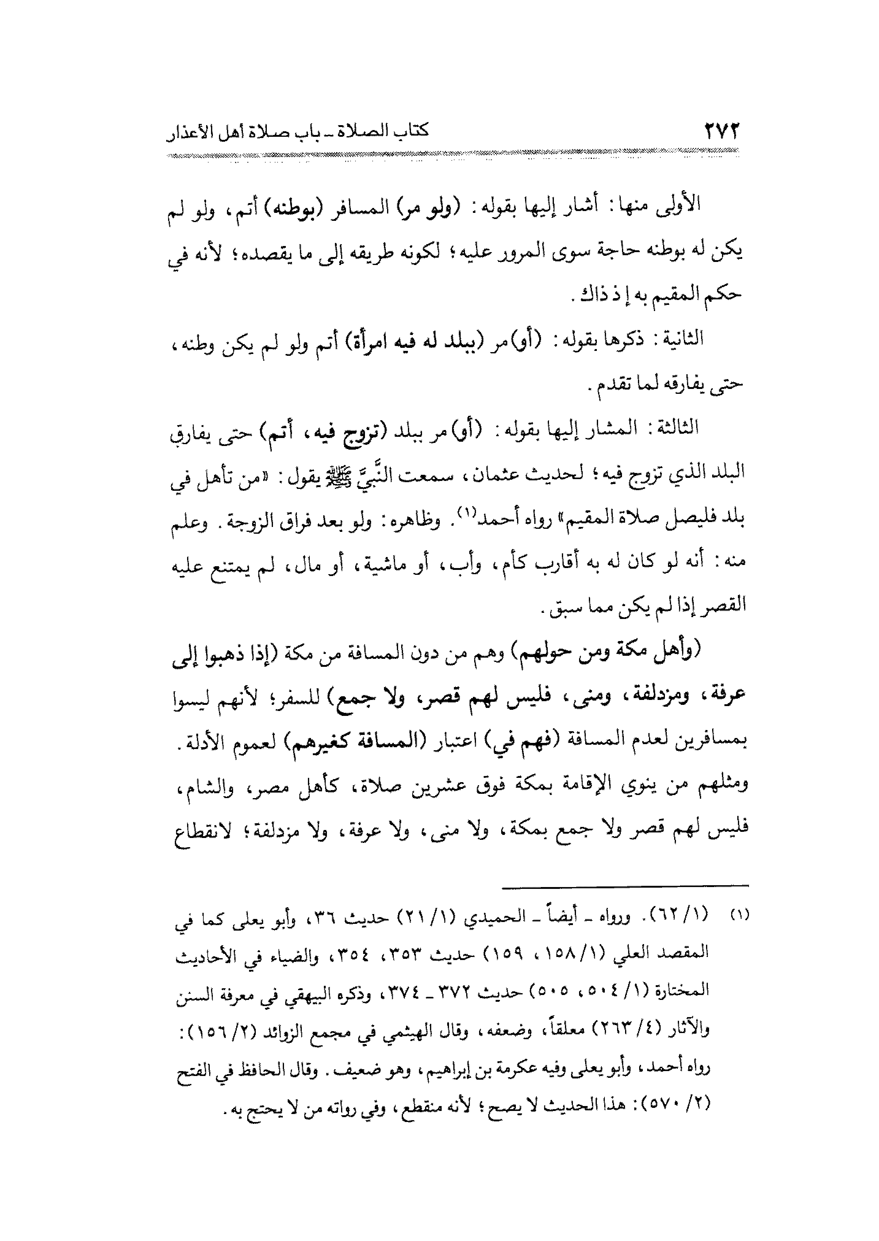 الثالثة: المشار إليها بقوله: (أو) مر ببلد (تزوج فيه، أتم) حتَّى يفارق البلد الذي تزوج فيه؛ لحديث عثمان، سمعت النَّبِيّ -صلى الله عليه وسلم- يقول: "من تأهل في بلد فليصل صلاة المقيم" رواه أَحْمد (¬١). وظاهره: ولو بعد فراق الزوجة. وعلم منه: أنَّه لو كان له به أقارب كأم، وأب، أو ماشية، أو مال، لم يمتنع عليه القصر إذا لم يكن مما سبق.