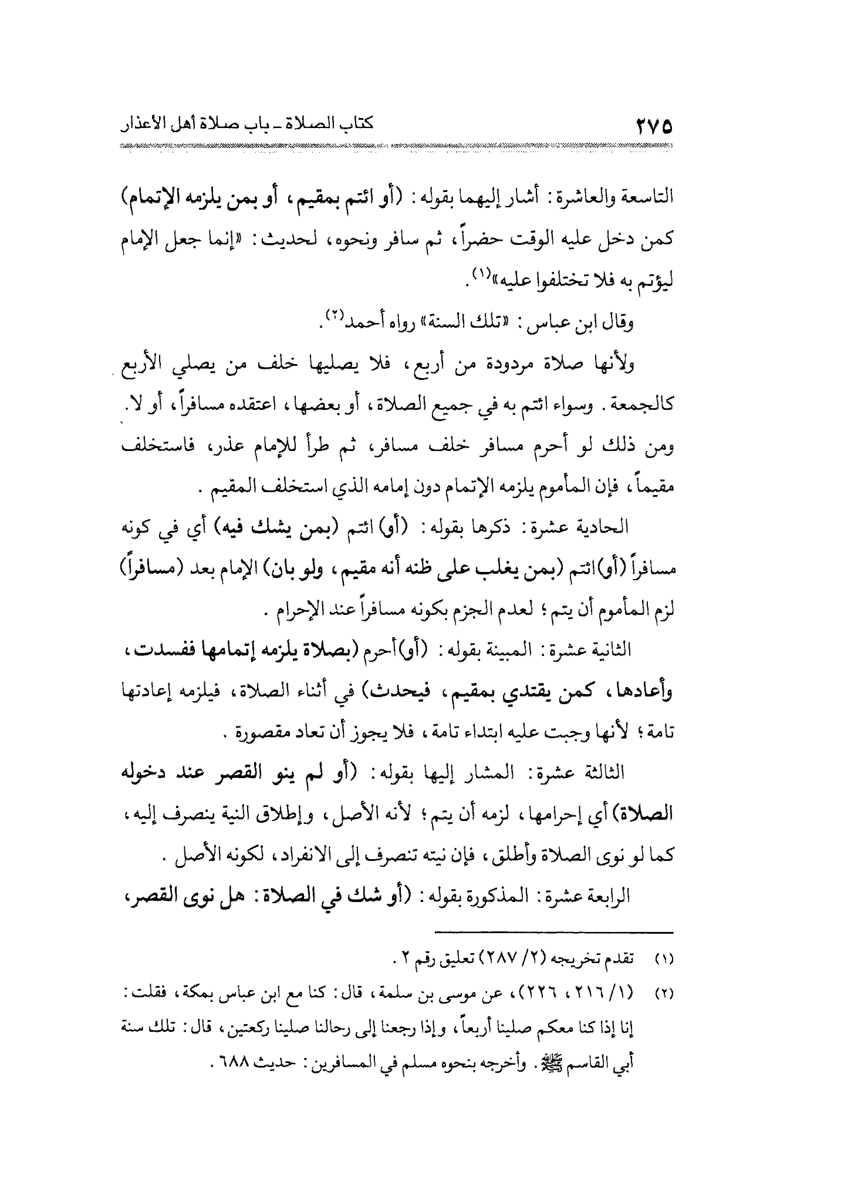 التاسعة والعاشرة: أشار إليهما بقوله: (أو ائتم بمقيم، أو بمن يلزمه الإتمام) كمن دخل عليه الوقت حضرًا، ثم سافر ونحوه، لحديث: "إنما جعل الإِمام ليؤتم به فلا تختلفوا عليه" (¬١).