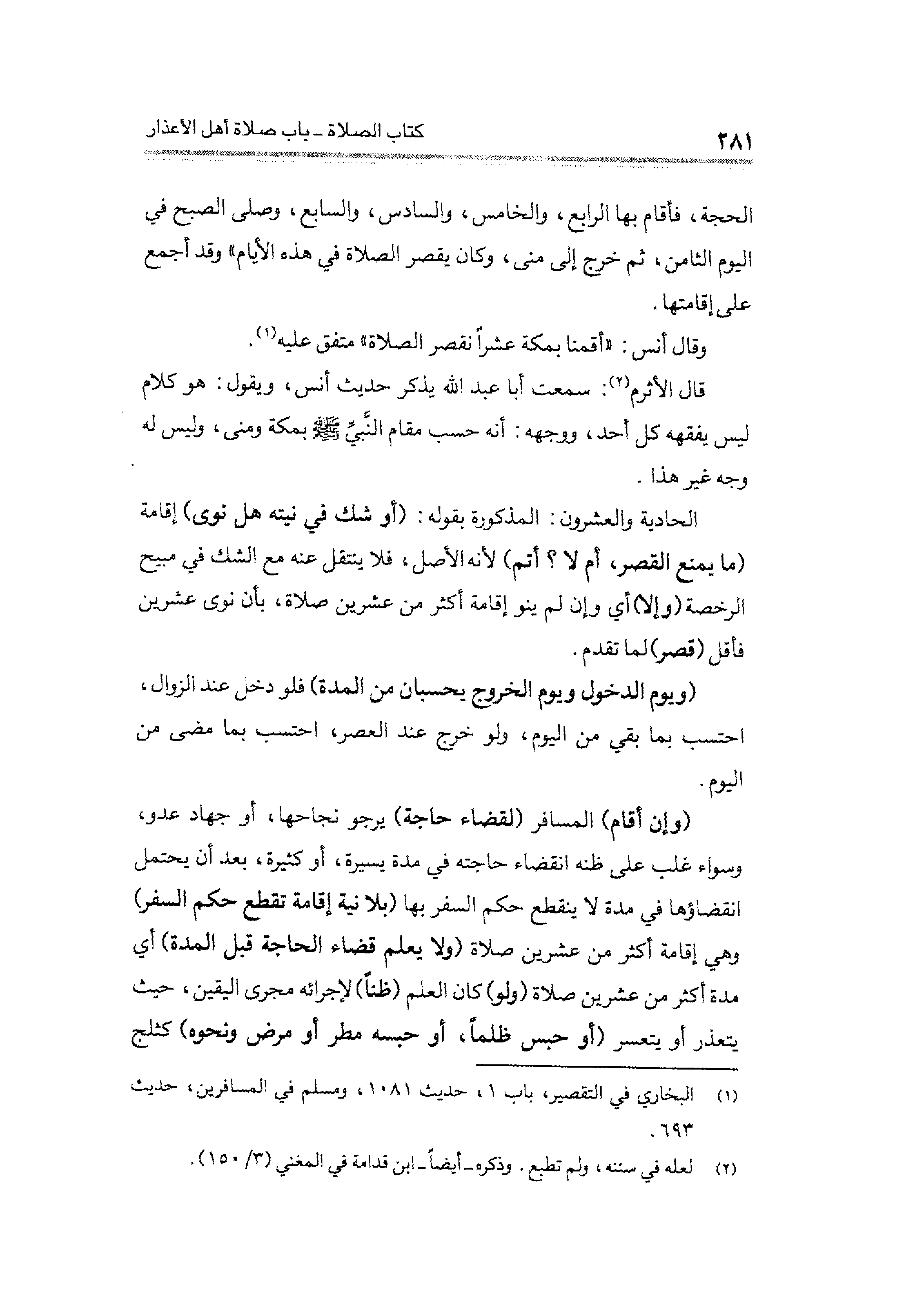 (وإن أقام) المسافر (لقضاء حاجة) يرجو نجاحها، أو جهاد عدو، وسواء غلب على ظنه انقضاء حاجته في مدة يسيرة، أو كثيرة، بعد أن يحتمل انقضاؤها في مدة لا ينقطع حكم السفر بها (بلا نية إقامة تقطع حكم السَّفر) وهي إقامة أكثر من عشرين صلاة (ولا يعلم قضاء الحاجة قبل المدة) أي مدة أكثر من عشرين صلاة (ولو) كان العلم (ظنًا) لإجرائه مجرى اليقين، حيث يتعذر أو يتعسر (أو حبس ظلمًا، أو حبسه مطر أو مرض ونحوه) كثلج