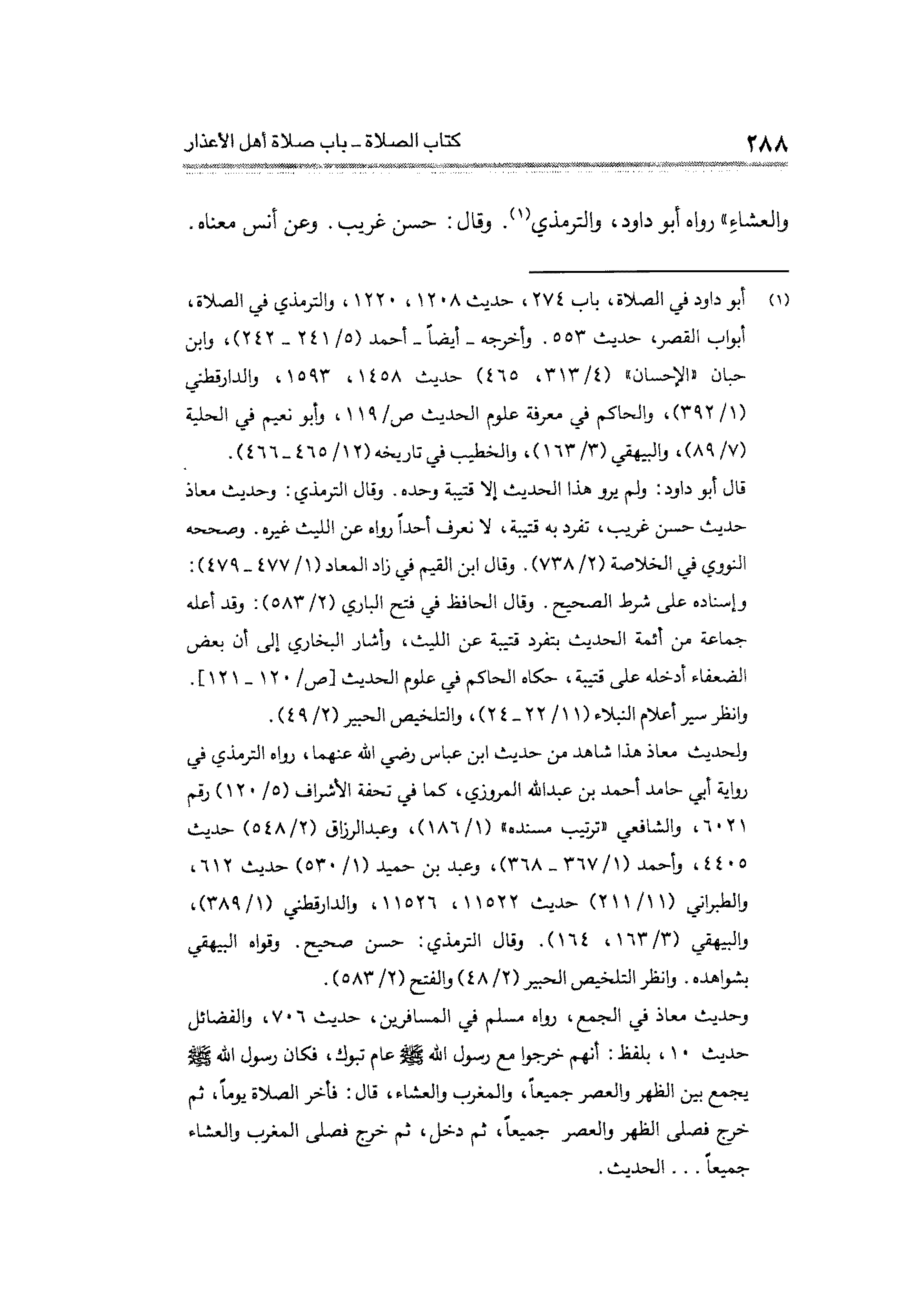 وحديث معاذ في الجمع، رواه مسلم في المسافرين، حديث ٧٠٦، والفضائل حديث ١٠، بلفظ: أنهم خرجوا مع رسول الله - صلى الله عليه وسلم - عام تبوك، فكان رسول الله - صَلَّى الله عليه وسلم - يجمع من الظهر والعصر جميعًا، والمغرب والعشاء، قال: فأخر الصَّلاة يومًا، ثم خرج فصلَّى الظهر والعصر جميعًا، ثم دخل، ثم خرج فصلَّى المغرب والعشاء جميعًا ... الحديث.