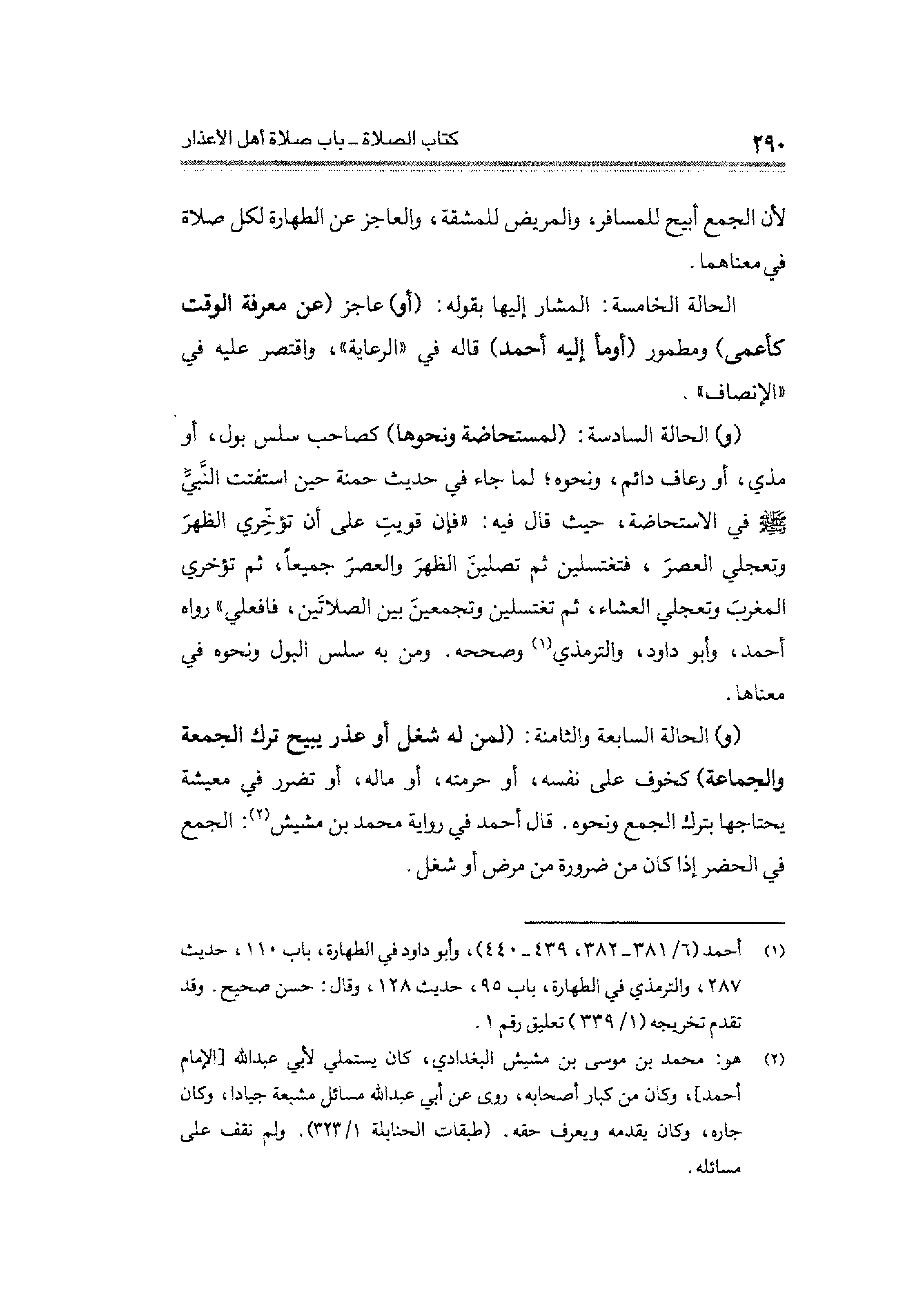 (و) الحالة السابعة والثامنة: (لمن له شغل أو عذر يبيح ترك الجمعة والجماعة) كخوف على نفسه، أو حرمته، أو ماله، أو تضرر في معيشة يحتاجها بترك الجمع ونحوه. قال أحمد في رواية محمد بن مشيش (¬٢): الجمع في الحضر إذا كان من ضرورة من عوض أو شغل.