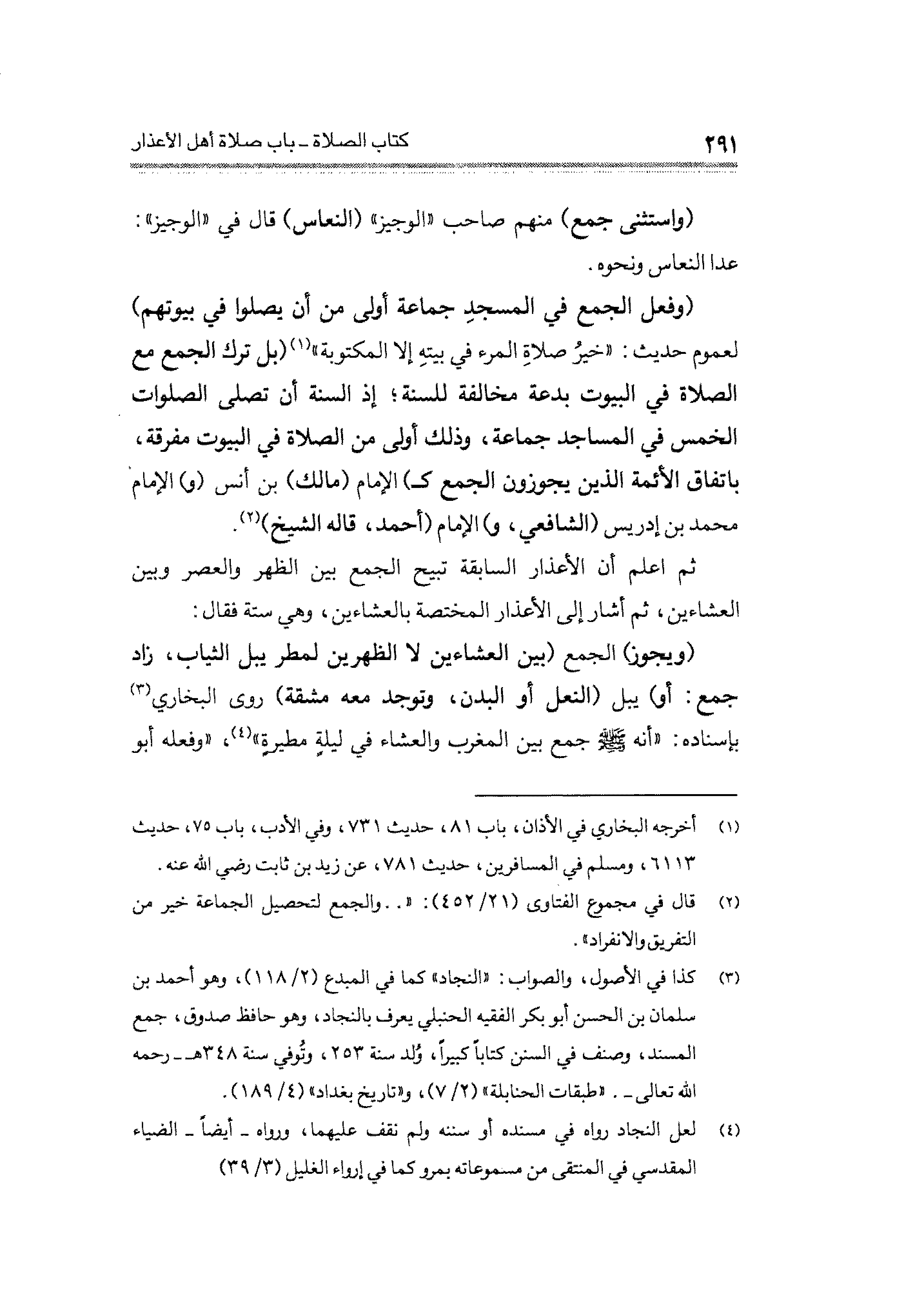 (وفعل المجمع في المسجدِ جماعة أولى من أن يصلوا في بيوتهم) لعموم حديث: "خيرُ صلاةِ المرء في بيتهِ إلا المكتوبة" (¬١) (بل ترك الجمع مع الصلاة في البيوت بدعة مخالفة للسنة؛ إذ السنة أن تصلى الصلوات الخمس في المساجد جماعة، وذلك أولى من الصلاة في البيوت مفرقة، باتفاق الأئمة الذين يجوزون الجمع كـ) الإمام (مالك) بن أنس (و) الإمام محمد بن إدريس (الشافعي، و) الإمام (أحمد، قاله الشيخ) (¬٢).