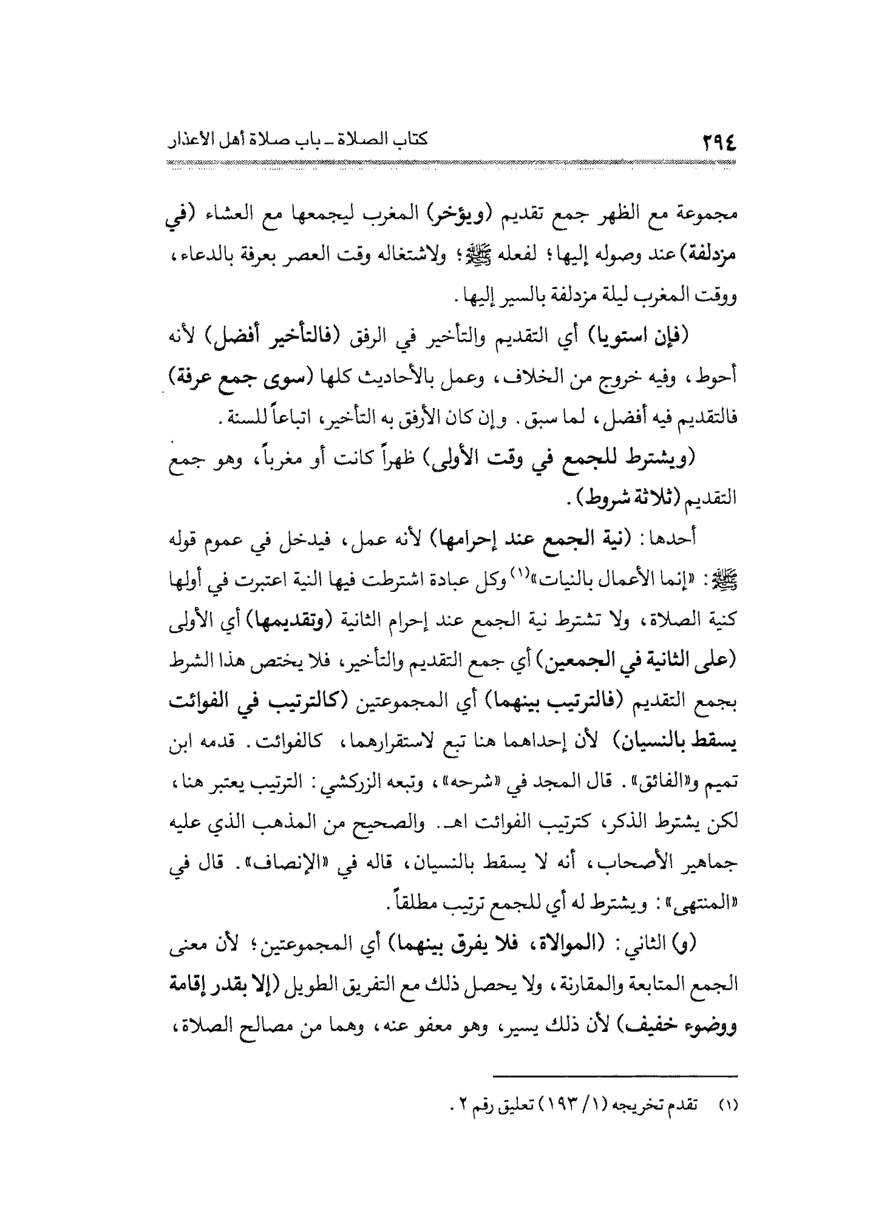 أحدها: (نية الجمع عند إحرامها) لأنه عمل، فيدخل في عموم قوله - صلى الله عليه وسلم -: "إنما الأعمال بالنيات" (¬١) وكل عبادة اشترطت فيها النية اعتبرت في أولها كنية الصلاة، ولا تشترط نية الجمع عند إحرام الثانية (وتقديمها) أي الأولى (على الثانية في الجمعين) أي جمع التقديم والتأخير، فلا يختص هذا الشرط بجمع التقديم (فالترتيب بينهما) أي المجموعتين (كالترتيب في الفوائت يسقط بالنسيان) لأن إحداهما هنا تبع لاستقرارهما، كالفوائت. قدمه ابن تميم و"الفائق". قال المجد في "شرحه"، وتبعه الزركشي. الترتيب يعتبر هنا، لكن يشترط الذكر، كترتيب الفوائت ا هـ. والصحيح من المذهب الَّذي عليه جماهير الأصحاب، أنَّه لا يسقط بالنسيان، قاله في "الإنصاف". قال في "المنتهى": ويشترط له أي للجمع ترتيب مطلقًا.