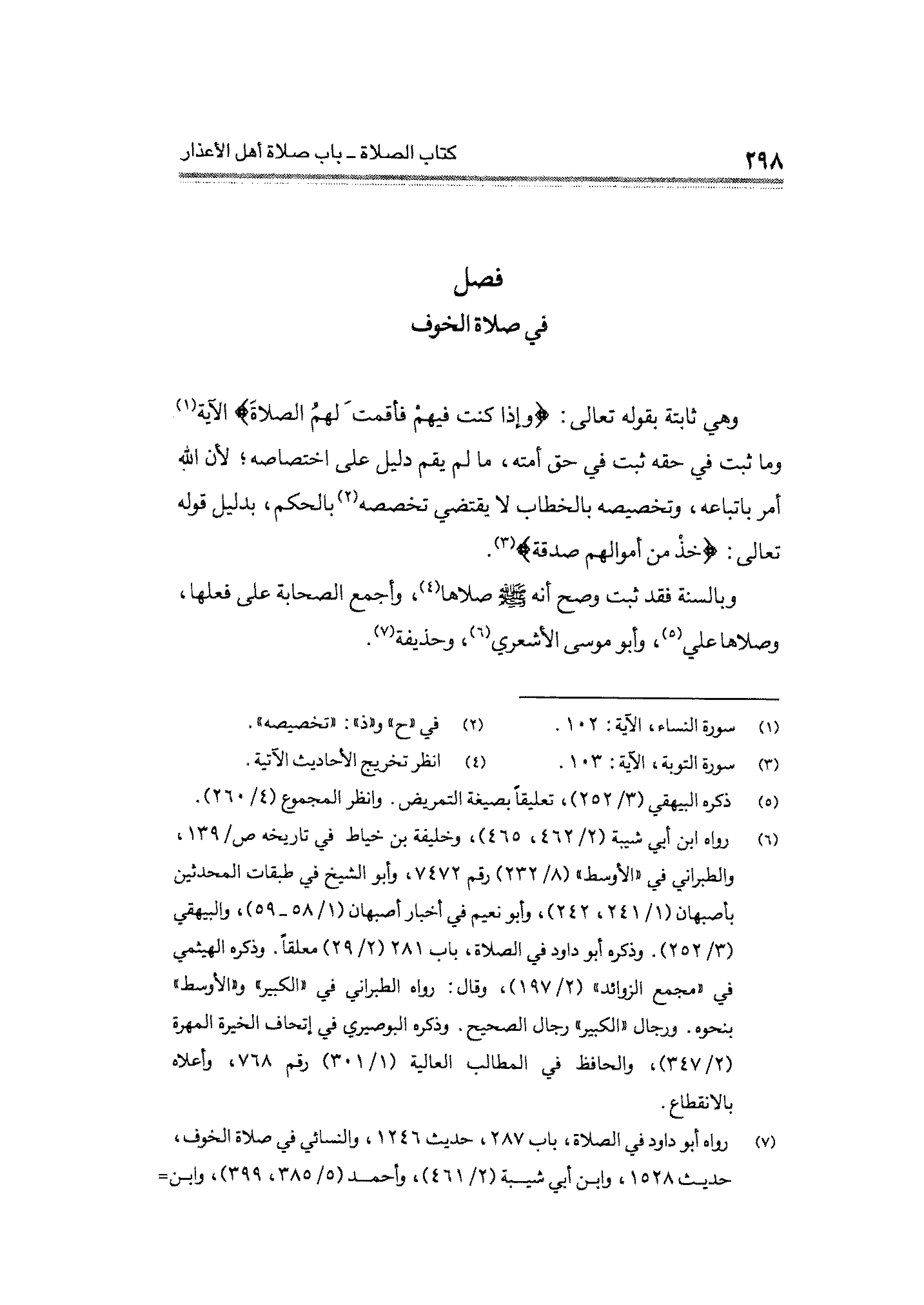 (¬٧) رواه أبو داود في الصلاة، باب ٢٨٧، حديث ١٢٤٦، والنسائي في صلاة الخوف، حديث ١٥٢٨، وابن أبي شيبة (٢/ ٤٦١)، وأحمد (٥/ ٣٨٥، ٣٩٩)، وابن =