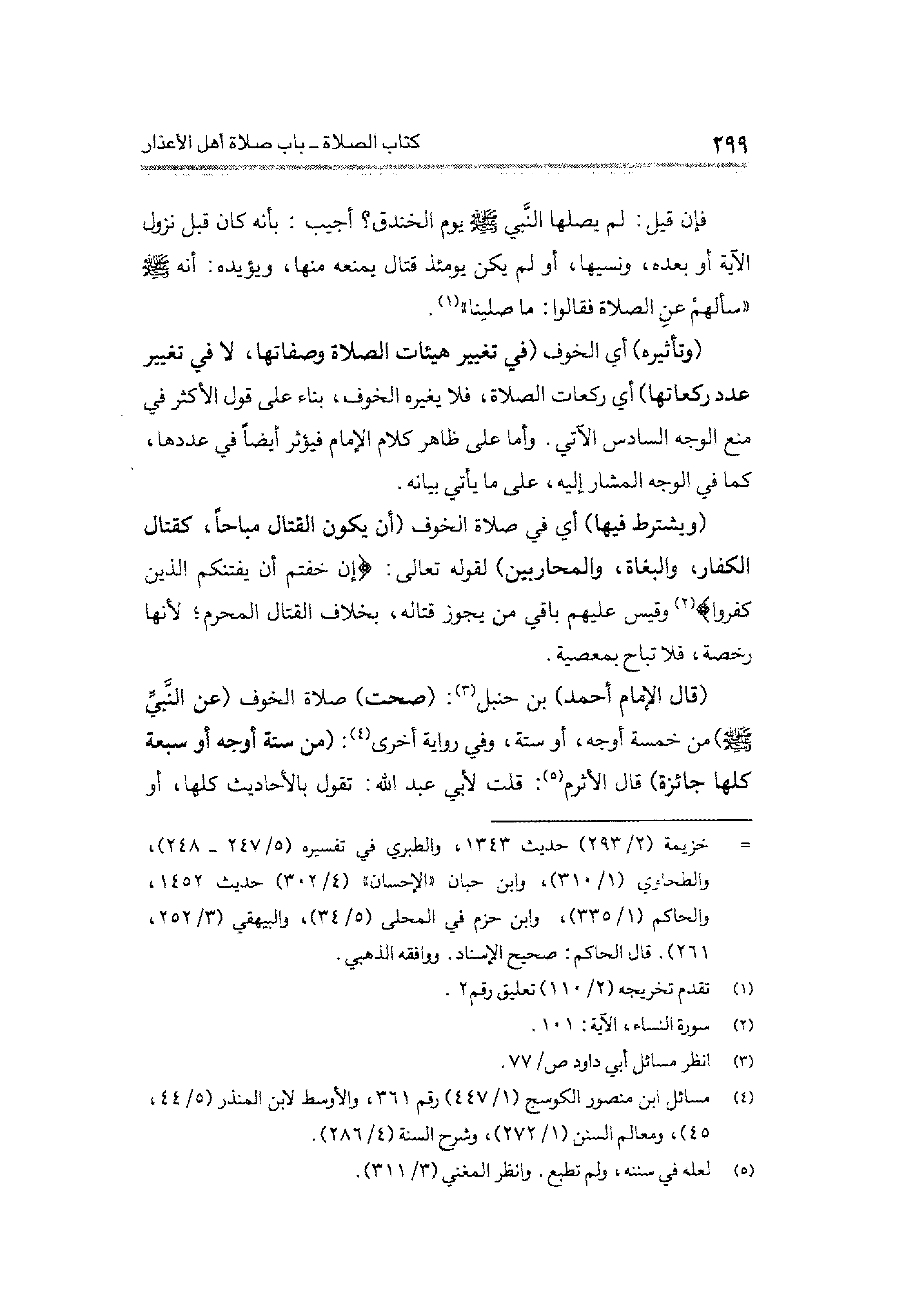 (قال الإمام أحمد) بن حنبل (¬٣): (صحت) صلاة الخوف (عن النَّبيِّ - صلى الله عليه وسلم -) (من خمسة أوجه، أو ستة، وفي رواية أخرى (¬٤): (من ستة أوجه أو سبعة كلها جائزة) قال الأثرم (¬٥): قلت لأبي عبد الله: تقول بالأحاديث كلها؛ أو
