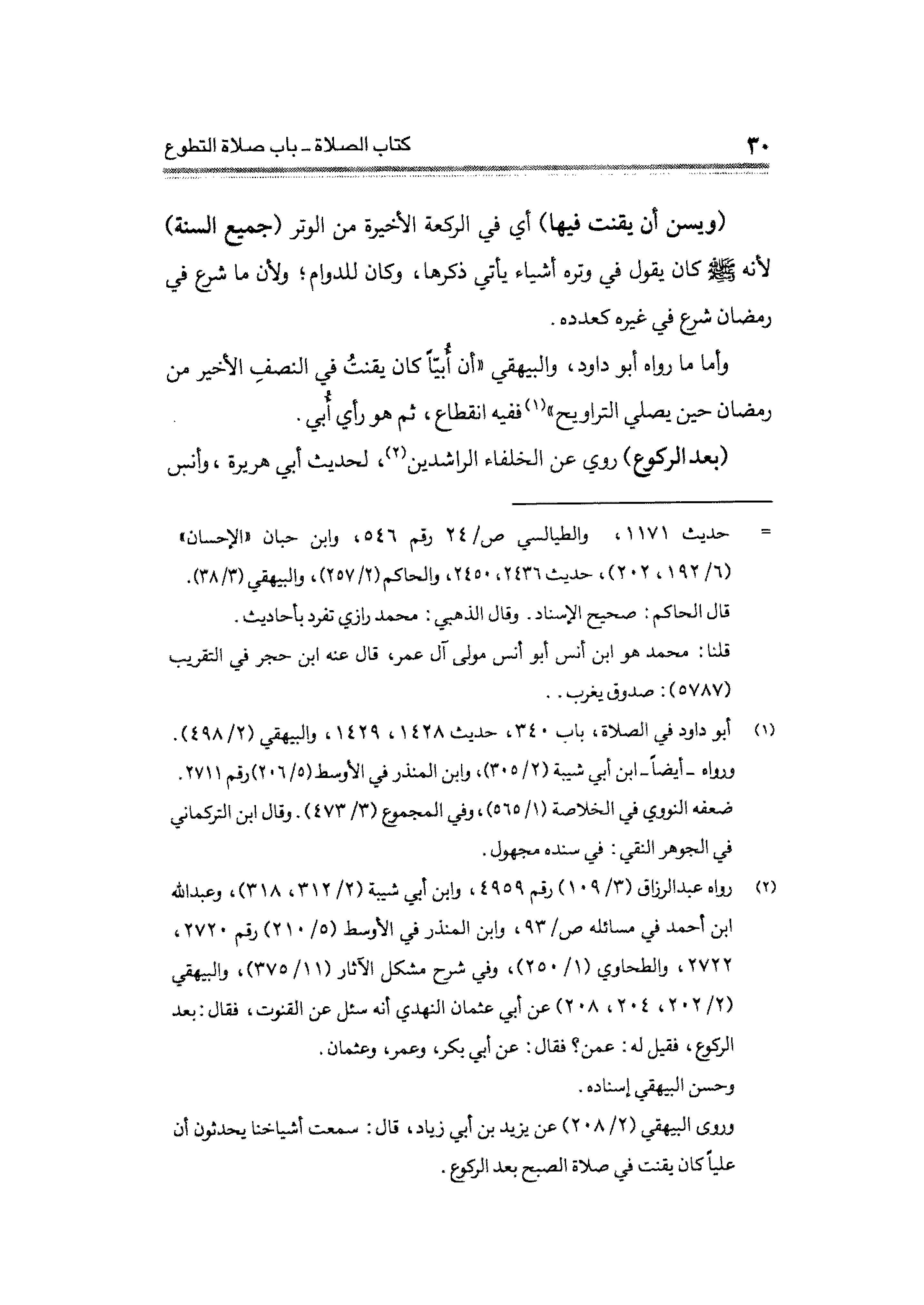 وأما ما رواه أبو داود، والبيهقي "أن أُبيًّا كان يقنت فى النصفِ الأخير من رمضان حين يصلي التراويح" (¬١) ففيه انقطاع، ثم هو رأي أُبي.