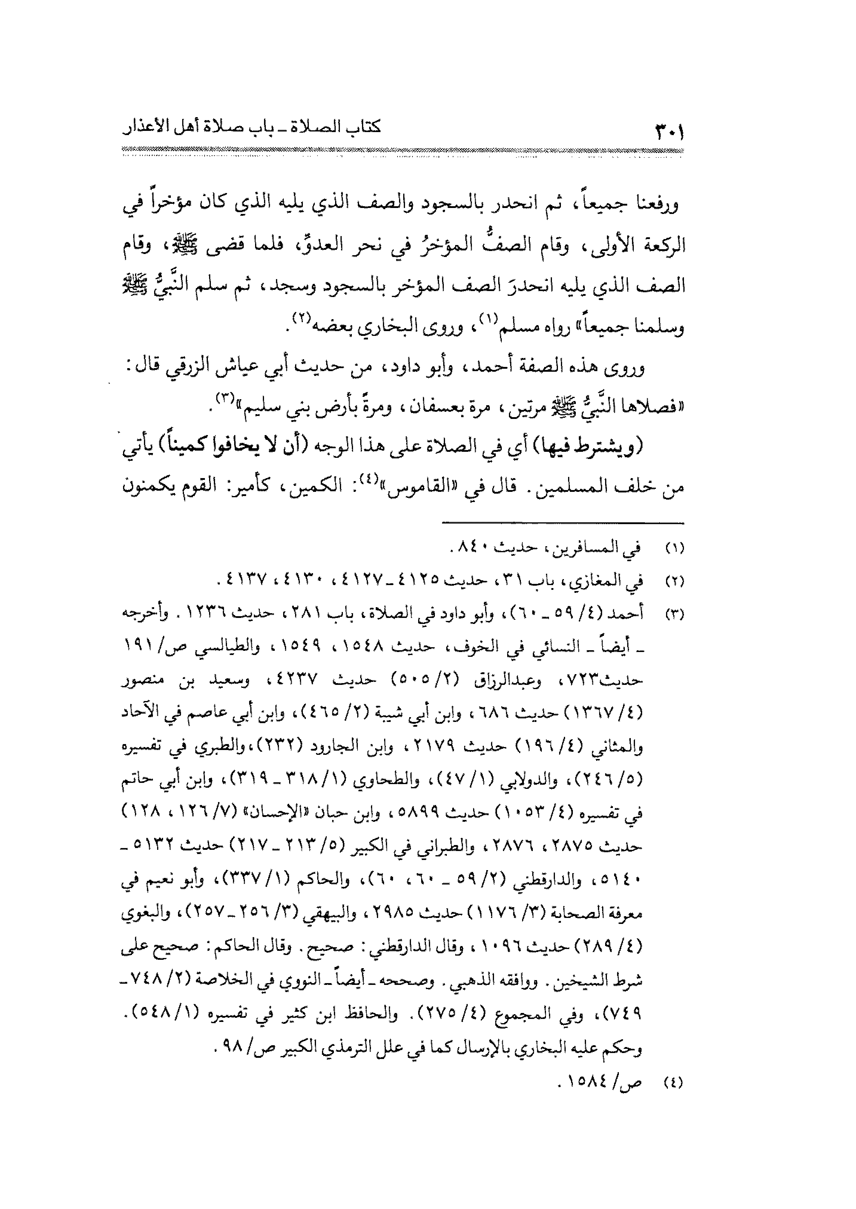 ورفعنا جميعًا، ثم انحدر بالسجود والصف الذي يليه الذي كان مؤخرًا في الركعة الأولى، وقام الصفُّ المؤخرُ في نحر العدوِّ، فلما قضى - صلى الله عليه وسلم -، وقام الصف الذي يليه انحدرَ الصف المؤخر بالسجود وسجد، ثم سلم النَّبيّ - صلى الله عليه وسلم - وسلمنا جميعًا" رواه مسلم (¬١)، وروى البخاري بعضه (¬٢).