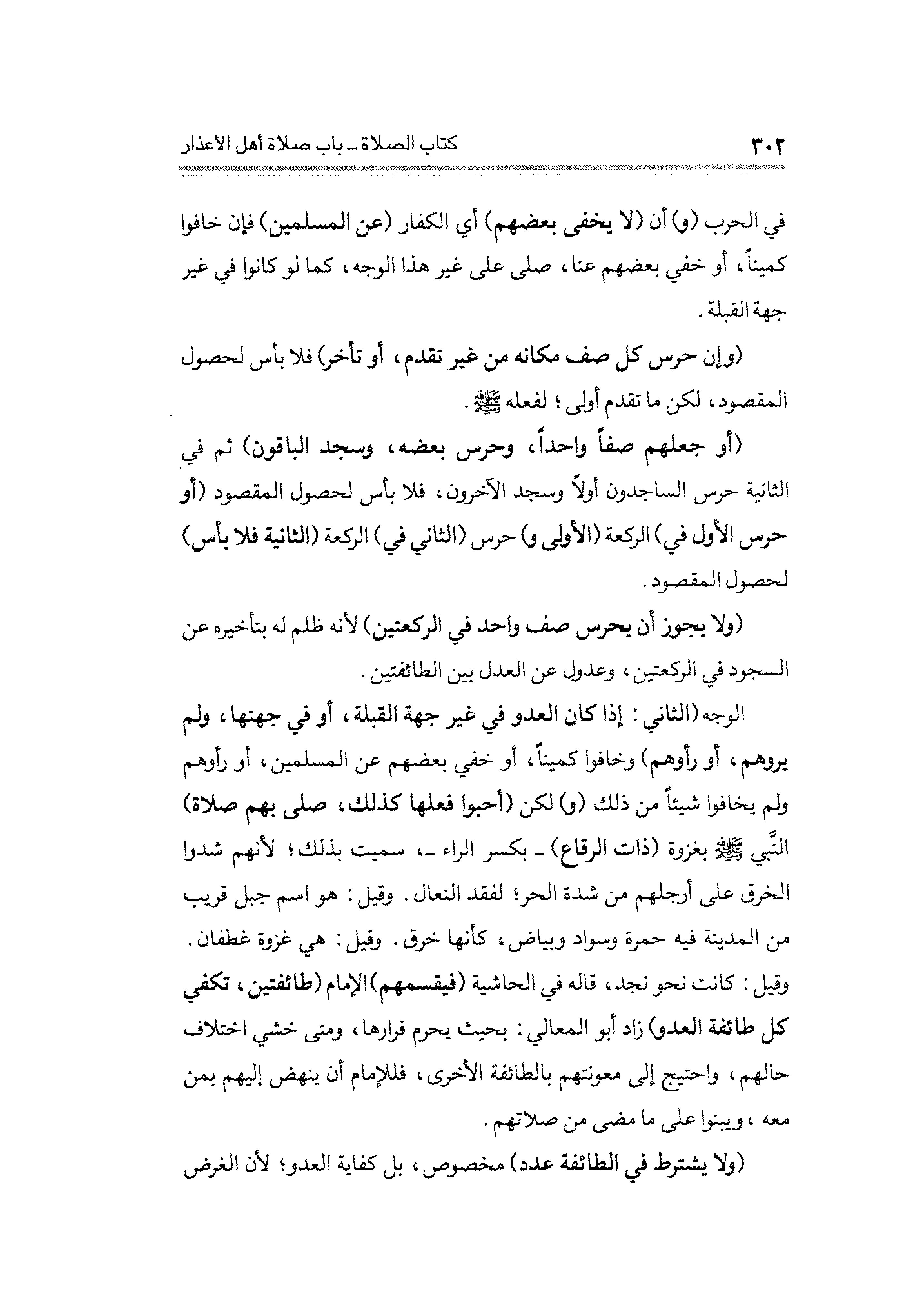 الوجه (الثاني: إذا كان العدو في غير جهة القبلة، أو في جهتها، ولم يروهم، أو رأوهم) وخافوا كمينًا، أو خفي بعضهم عن المسلمين، أو رأوهم ولم يخافوا شيئًا من ذلك (و) لكن (أحبوا فعلها كذلك، صلى بهم صلاة) النَّبي بغزوة (ذات الرقاع) -بكسر الراء-، سميت بذلك؛ لأنهم شدوا الخرق على أرجلهم من شدة الحر؛ لفقد النعال. وقيل: هو اسم جبل قريب من المدينة في حمرة وسواد وبياض، كأنها خرق. وقيل: هي غزوة غطفان. وقيل: كانت نحو نجد، قاله في الحاشية (فيقسمهم) الإمام (طائفتين، تكفي كل طائفة العدو) زاد أبو المعالي: بحيث يحرم فرارها، ومتى خشي اختلاف حالهم، واحتيج إلى معونتهم بالطائفة الأخرى، فللإمام أن ينهض إليهم بمن معه، ويبنوا على ما مضى من صلاتهم.