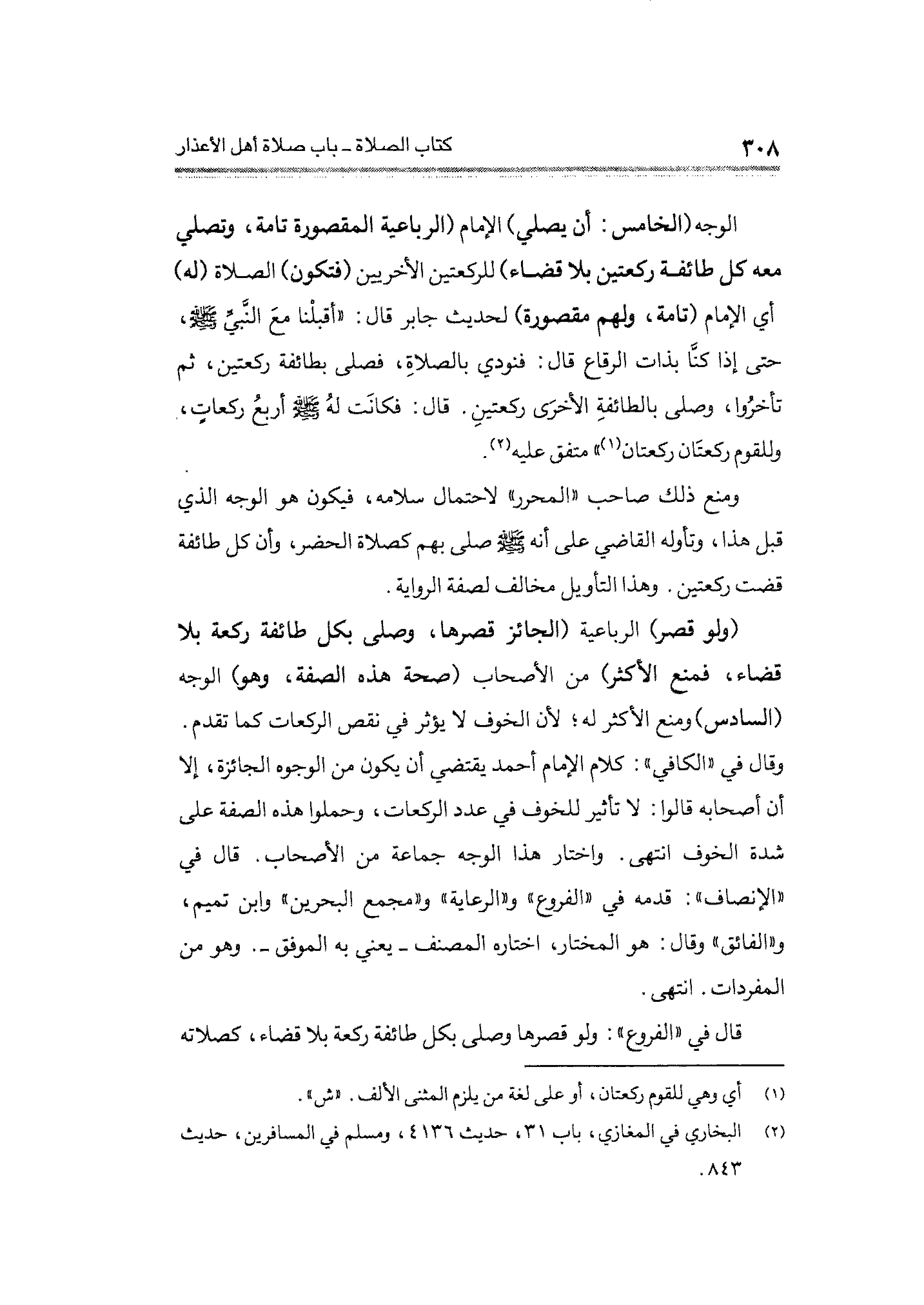 ومنع ذلك صاحب "المحرر" لاحتمال سلامه، فيكون هو الوجه الذي قبل هذا، وتأوله القاضي على أنه - صلى الله عليه وسلم - صلى بهم كصلاة الحضر، وأن كل طائفة قضت ركعتين. وهذا التأويل مخالف لصفة الرواية.