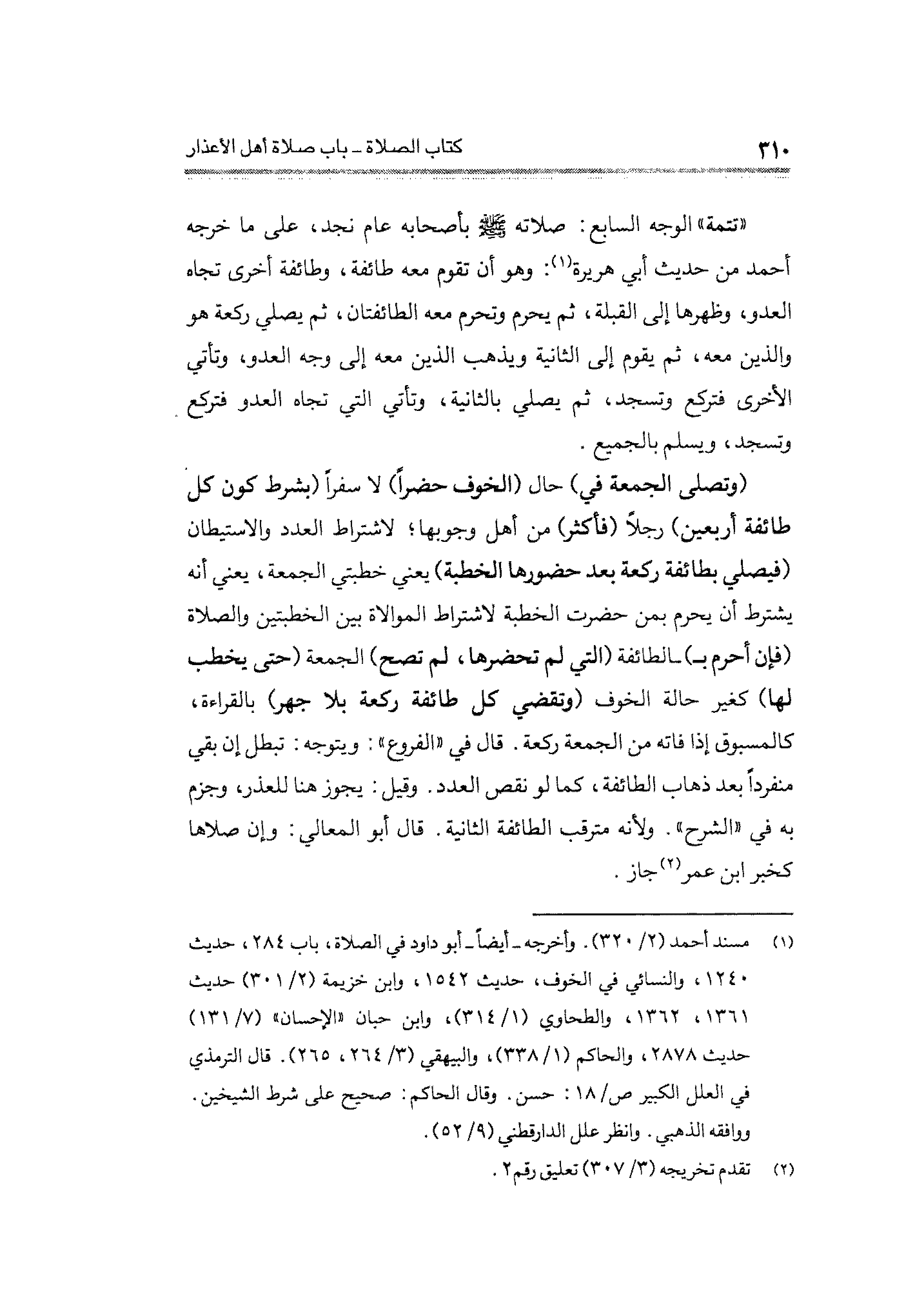 (¬١) مسند أحمد (٢/ ٣٢٠). وأخرجه -أيضًا- أبو داود في الصلاة، باب ٢٨٤، حديث ١٢٤٠، والنسائي في الخوف، حديث ١٥٤٢، وابن خزيمة (٢/ ٣٠١) حديث ١٣٦١، ١٣٦٢، والطحاوي (١/ ٣١٤)، وابن حبان "الإحسان" (٧/ ١٣١) حديث ٢٨٧٨، والحاكم (١/ ٣٣٨)، والبيهقي (٣/ ٢٦٤، ٢٦٥). قال الترمذي في العلل الكبير ص/١٨: حسن. وقال الحاكم: صحيح على شرط الشيخين. ووافقه الذهبي. وانظر علل الدارقطني (٩/ ٥٢).