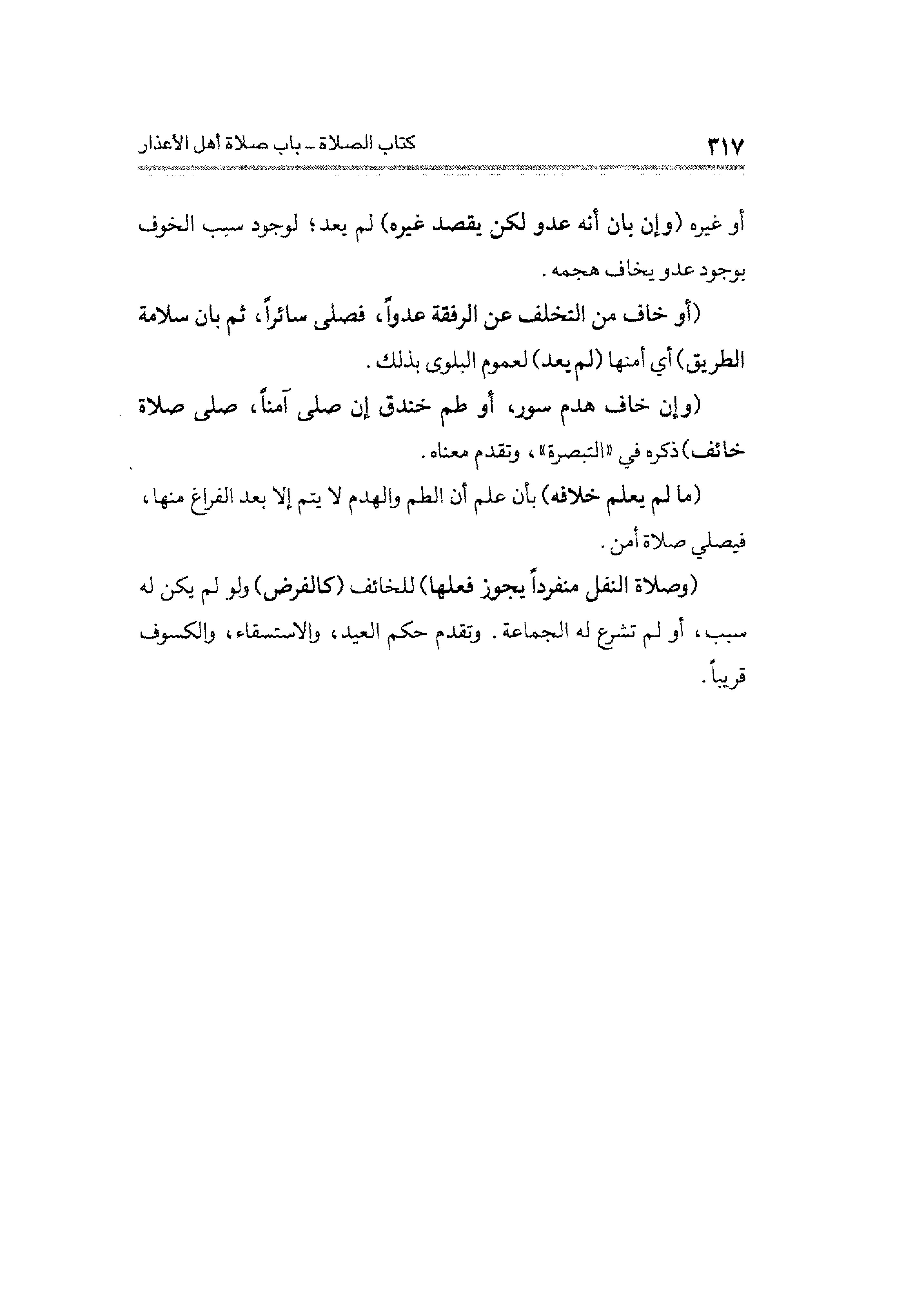 (وصلاة النفل منفردًا يجوز فعلها) للخائف (كالفرض) ولو لم يكن له سبب، أو لم تشرع له الجماعة. وتقدم حكم العيد، والاستسقاء، والكسوف قريبًا.