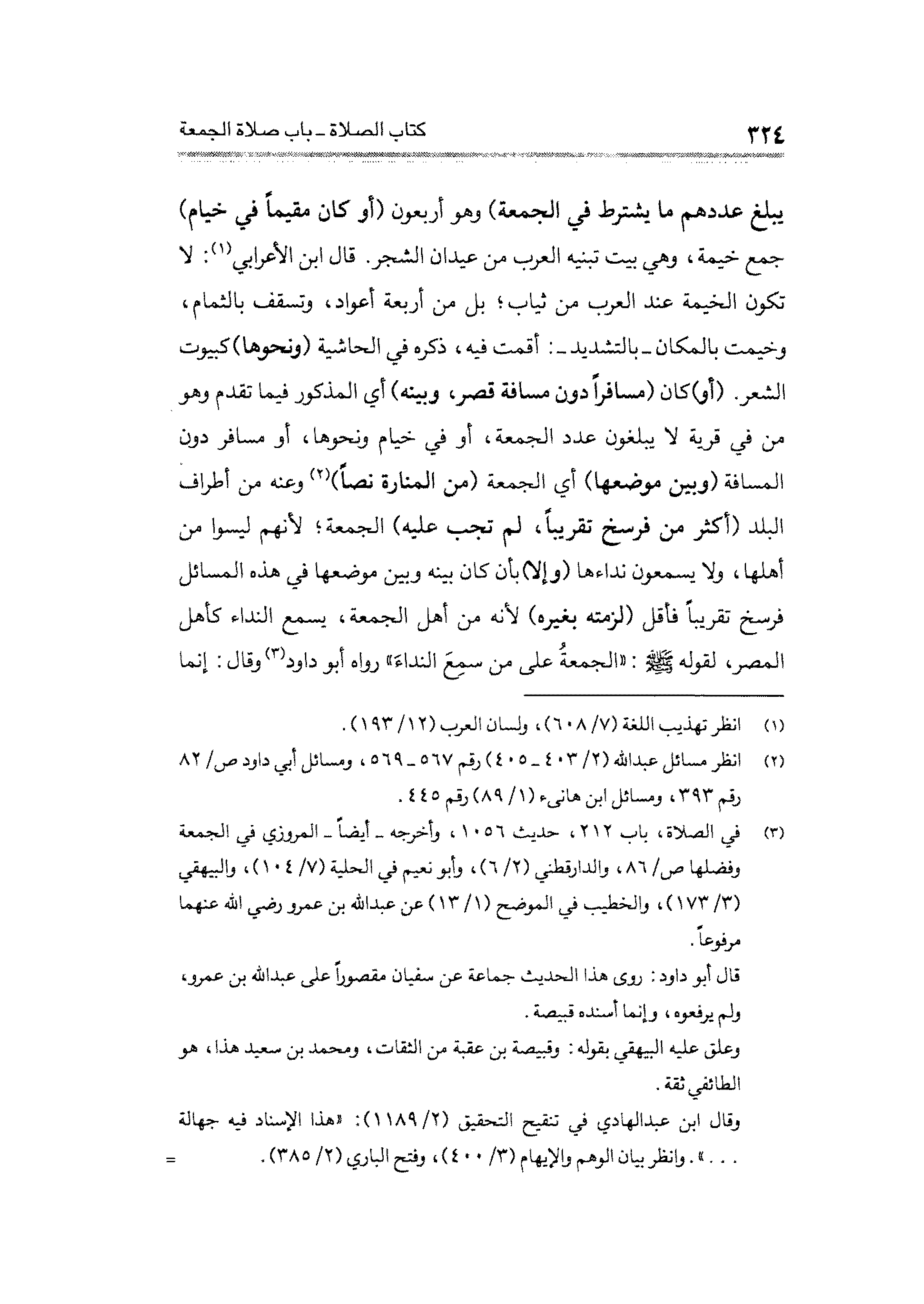 يبلغ عددهم ما يشترط في الجمعة) وهو أربعون (أو كان مقيمًا في خيام) جمع خيمة، وهي بيت تبنيه العرب من عيدان الشجر. قال ابن الأعرابي (¬١): لا تكون الخيمة عند العرب من ثياب؛ بل من أربعة أعواد، وتسقف بالثمام، وخيمت بالمكان -بالتشديد-: أقمت فيه، ذكره في الحاشية (ونحوها) كبيوت الشعر. (أو) كان (مسافرًا دون مسافة قصر، وبينه) أي المذكور فيما تقدم وهو من في قرية لا يبلغون عدد الجمعة، أو في خيام ونحوها، أو مسافر دون المسافة (وبين موضعها) أي الجمعة (من المنارة نصًّا) (¬٢) وعنه من أطراف البلد (أكثر من فرسخ تقريبًا، لم تجب عليه) الجمعة؛ لأنهم ليسوا من أهلها، ولا يسمعون نداءها (وإلا) بأن كان بينه وبين موضعها في هذه المسائل فرسخ تقريبًا فأقل (لزمته بغيره) لأنه من أهل الجمعة، يسمع النداء كأهل المصر، لقوله - صلى الله عليه وسلم -: "الجمعةُ على من سمعَ النداءَ" رواه أبو داود (¬٣) وقال: إنما