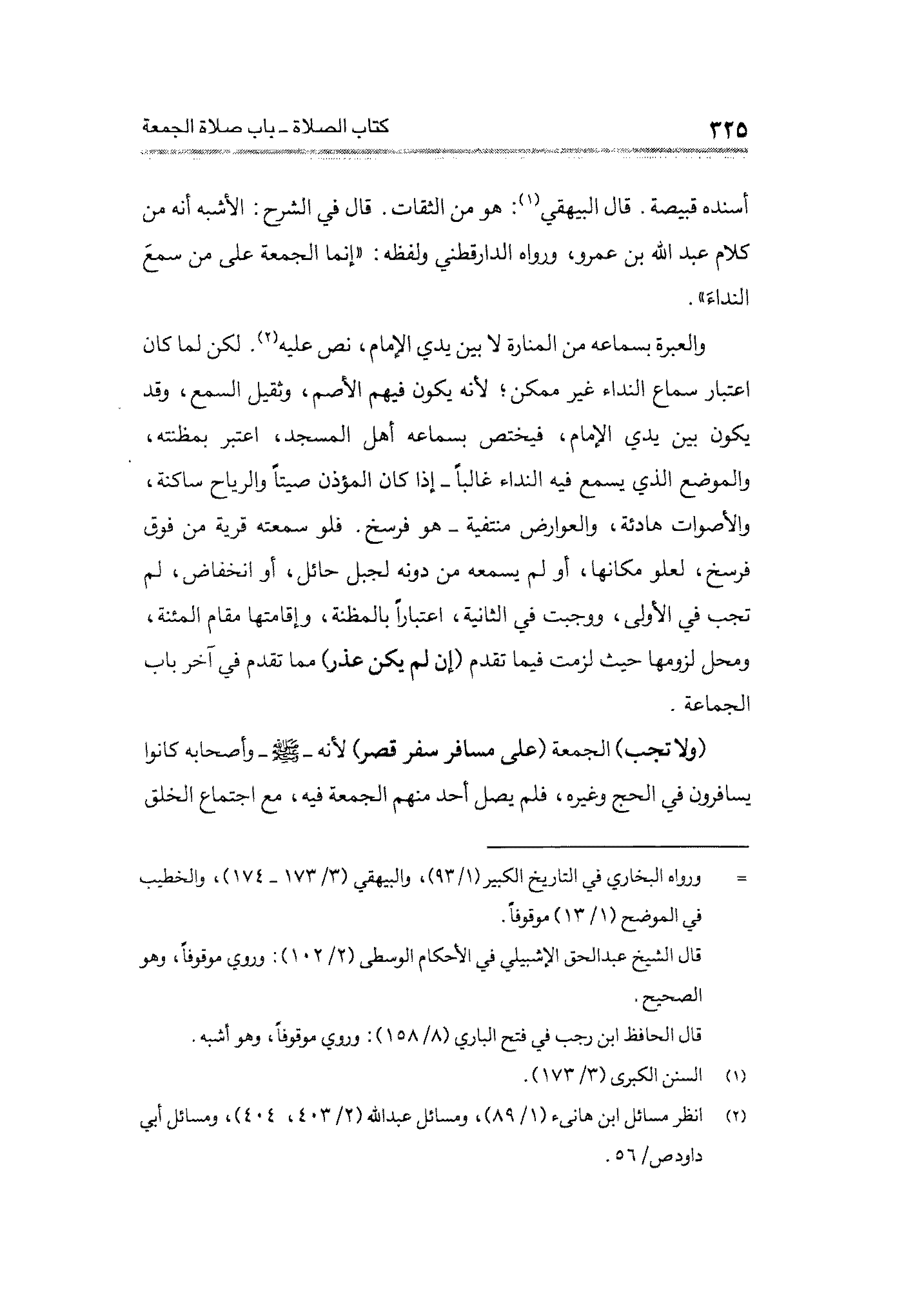أسنده قبيصة. قال البيهقي (¬١): هو من الثقات. قال في الشرح: الأشبه أنه من كلام عبد الله بن عمرو، ورواه الدارقطني ولفظه: "إنما الجمعة على من سمعَ النداءَ".