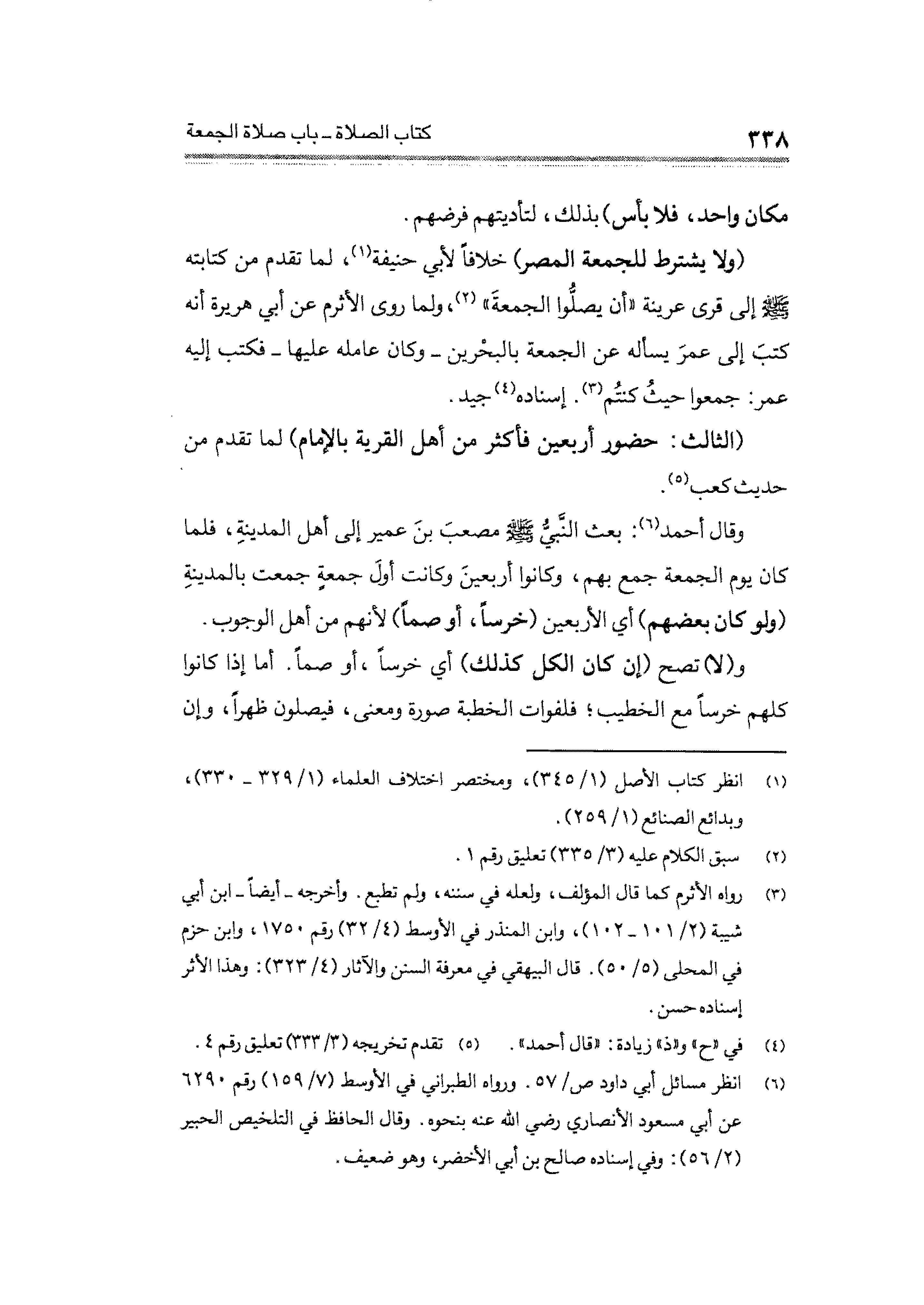 (ولا يشترط للجمعة العصر) خلافًا لأبي حنيفة (¬١)، لما تقدم من كتابته - صلى الله عليه وسلم - إلى قرى عرينة "أن يصلُّوا الجمعةَ" (¬٢)، ولما روى الأثرم عن أبي هريرة أنه كتبَ إلى عمرَ يسأله عن الجمعة بالبحْرين -وكان عامله عليها- فكتب إليه عمر: جمعوا حيث كنتُم (¬٣). إسناده (¬٤) جيد.