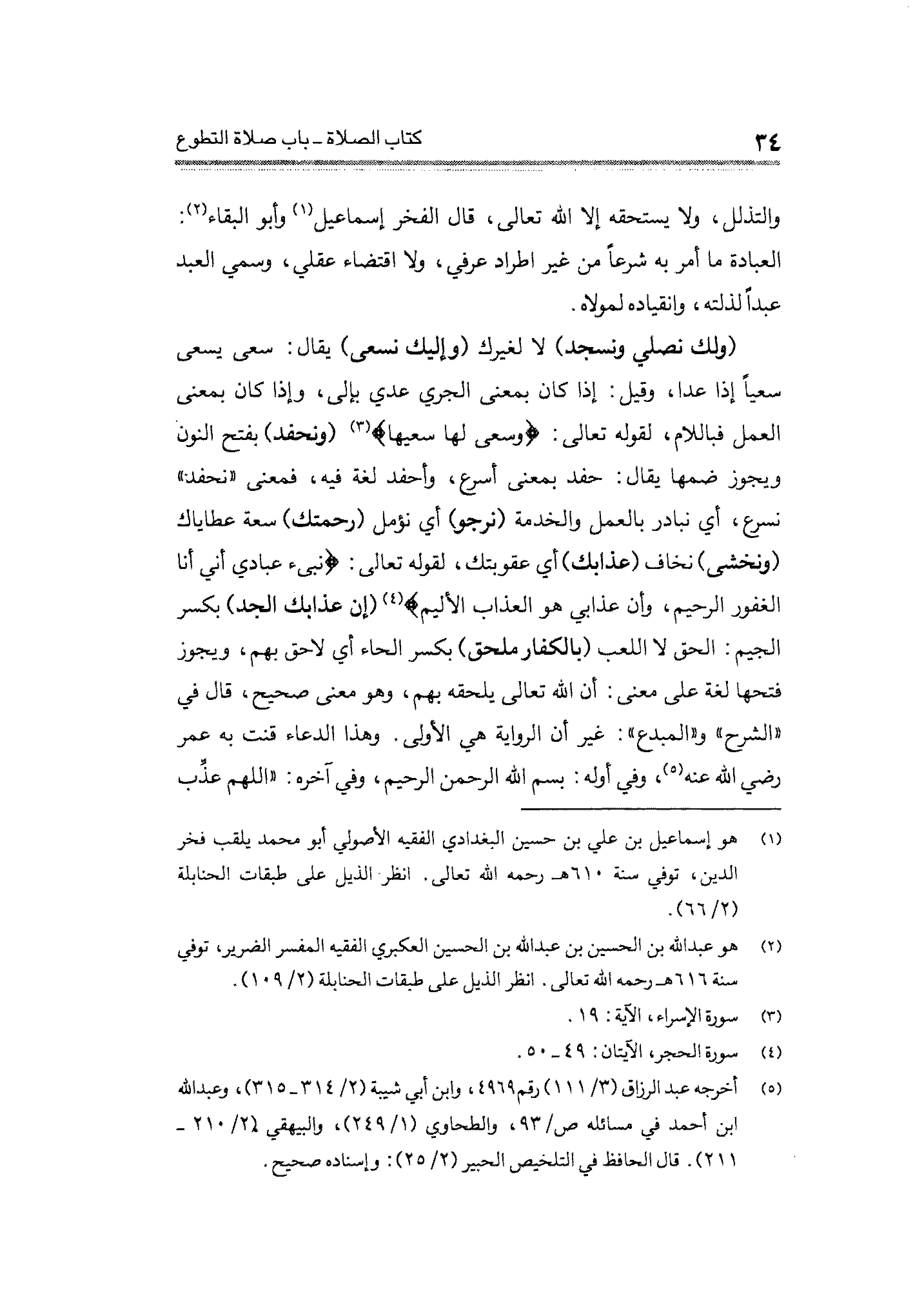 (ولك نصلي ونسجد) لا لغيرك (وإليك نسعى) يقال: سعى يسعى سعيًا إذا عدا، وقيل: إذا كان بمعنى الجري عدي بإلي، وإذا كان بمعنى العمل فباللام، لقوله تعالى: {وَسَعَى لَهَا سَعْيَهَا} (¬٣) (ونحفد) بفتح النون ويجوز ضمها يقال: حفد بمعنى أسرع، وأحفد لغة فيه، فمعني "نحفد" نسرع؛ أي نبادر بالعمل والخدمة (نرجو) أي نؤمل (رحمتك) سعة عطاياك (ونخشى) نخاف (عذابك) أي عقوبتك، لقوله تعالى: {نَبِّئْ عِبَادِي أَنِّي أَنَا الْغَفُورُ الرَّحِيمُ، وَأَنَّ عَذَابِي هُوَ الْعَذَابُ الْأَلِيمُ} (¬٤) (إن عذابك الجد) بكسر الجيم: الحق لا اللعب (بالكفار ملحق) بكسر الحاء أي لاحق بهم، ويجوز فتحها لغة على معنى: أن الله تعالى يلحقه بهم، وهو معنى صحيح، قال في "الشَّرح"و"المبدع": غير أن الرّواية هي الأولى. وهذا الدعاء قنت به عمر رضي الله عنه (¬٥)، وفي أوله: بسم الله الرحمن الرحيم، وفي آخره: "اللَّهم عذب