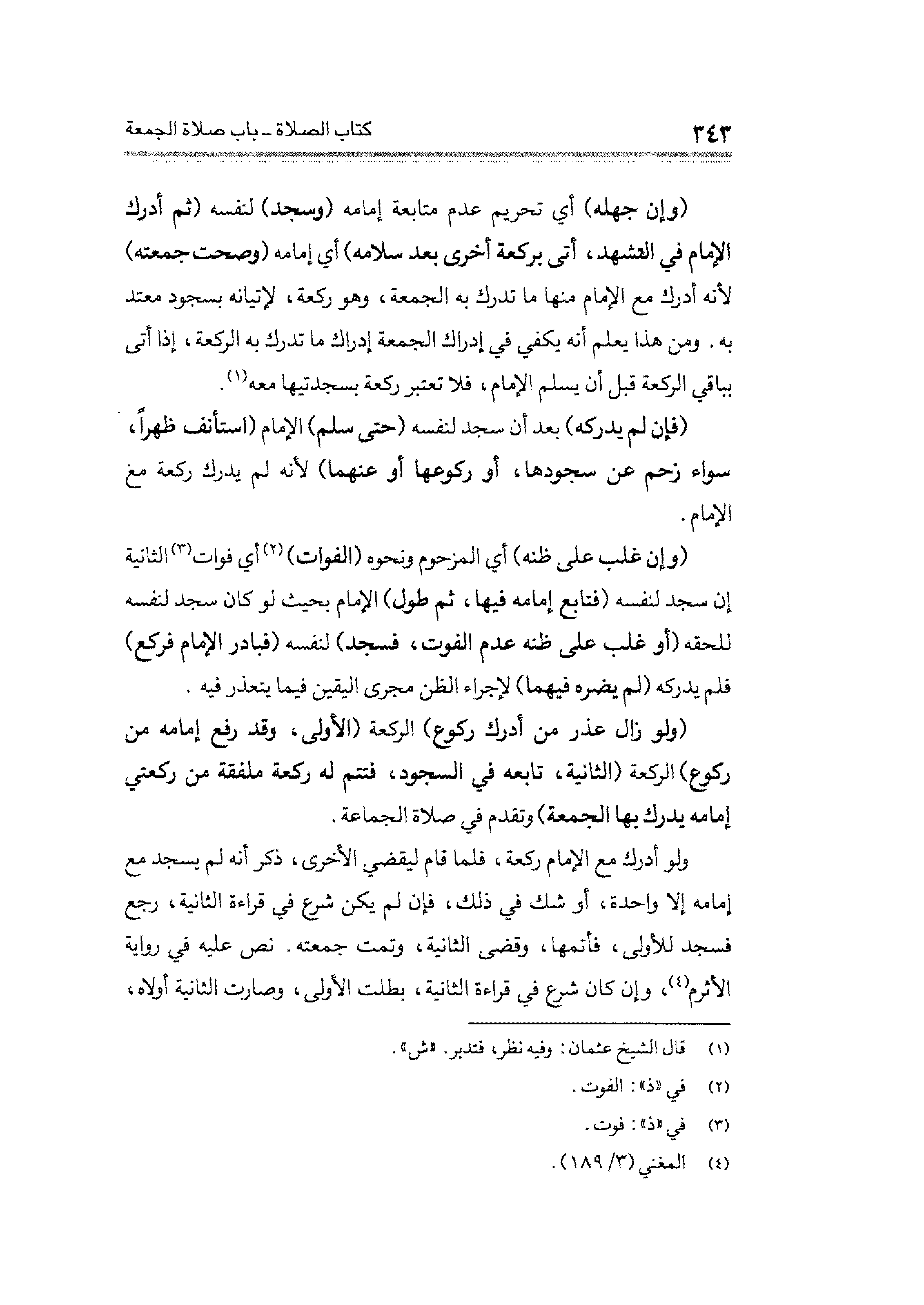 (وإن جهله) أي تحريم عدم متابعة إمامه (وسجد) نفسه (ثم أدرك الإمام في التشهد، أتي ركعة أخرى بعد سلامه) أي إمامه (وصحت جمعته) لأنه أدرك مع الإمام منها ما تدرك به الجمعة، وهو ركعة، لإتيانه بسجود معتد به. ومن هذا يعلم أنه يكفي في إدراك الجمعة إدراك ما تدرك به الركعة، إذا أتى بباقي الركعة قبل أن يسلم الإمام، فلا تعتبر ركعة بسجدتيها معه (¬١).