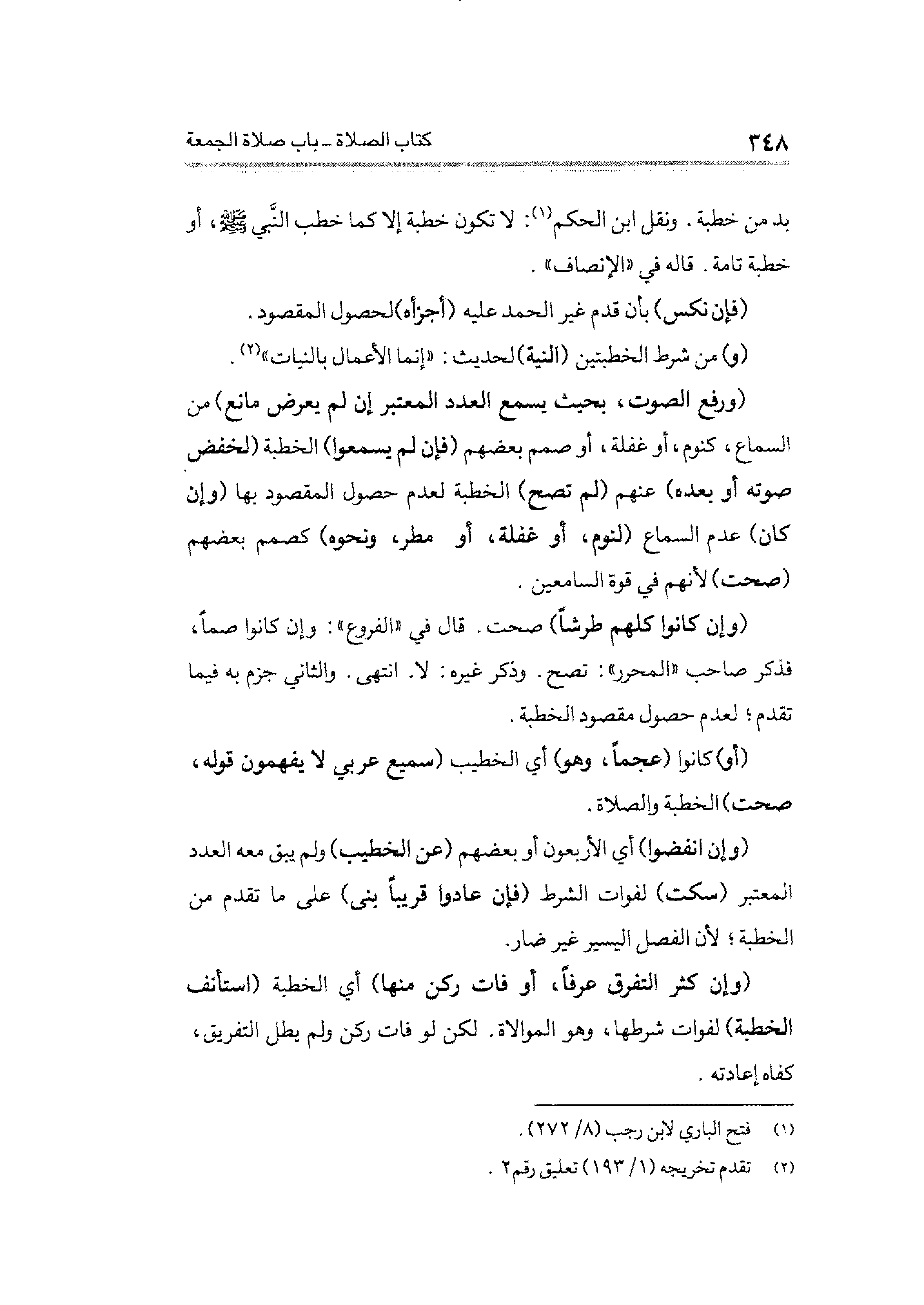 (ورفع الصوت، بحيث يسمع العدد المعتبر إن لم يعرض مانع) من السماع، كنوم، أو غفلة، أو صمم بعضهم (فإن لم يسمعوا) الخطبة (لخفض صوته أو بعده) عنهم (لم تصح) الخطبة لعدم حصول المقصود بها (وإن كان) عدم السماع (لنوم، أو غفلة، أو مطر، ونحوه) كصمم بعضهم (صحت) لأنهم في قوة السامعين.