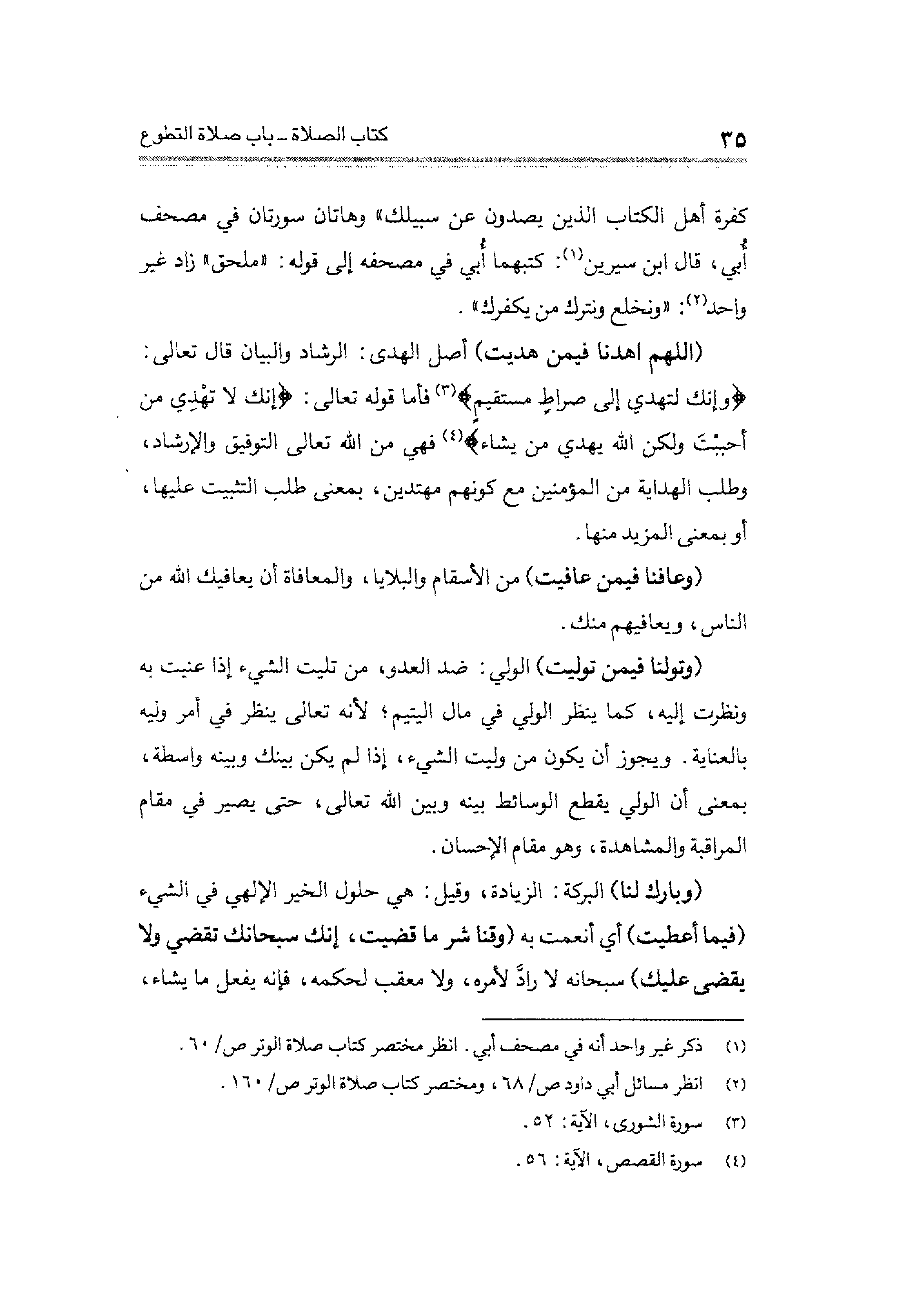 (اللَّهم اهدنا فيمن هديت) أصل الهدى: الرشاد والبيان قال تعالى: {وَإِنَّكَ لَتَهْدِي إِلَى صِرَاطٍ مُسْتَقِيمٍ} (¬٣) فأمَّا قوله تعالى: {إِنَّكَ لَا تَهْدِي مَن أَحْبَبْتَ وَلَكِنَّ اللَّهَ يَهْدِي مَنْ يَشَاءُ} (¬٤) فهي من الله تعالى التوفيق والإرشاد، وطلب الهداية من المؤمنين مع كونهم مهتدين، بمعنى طلب التثبيت عليها، أو بمعنى المزيد منها.