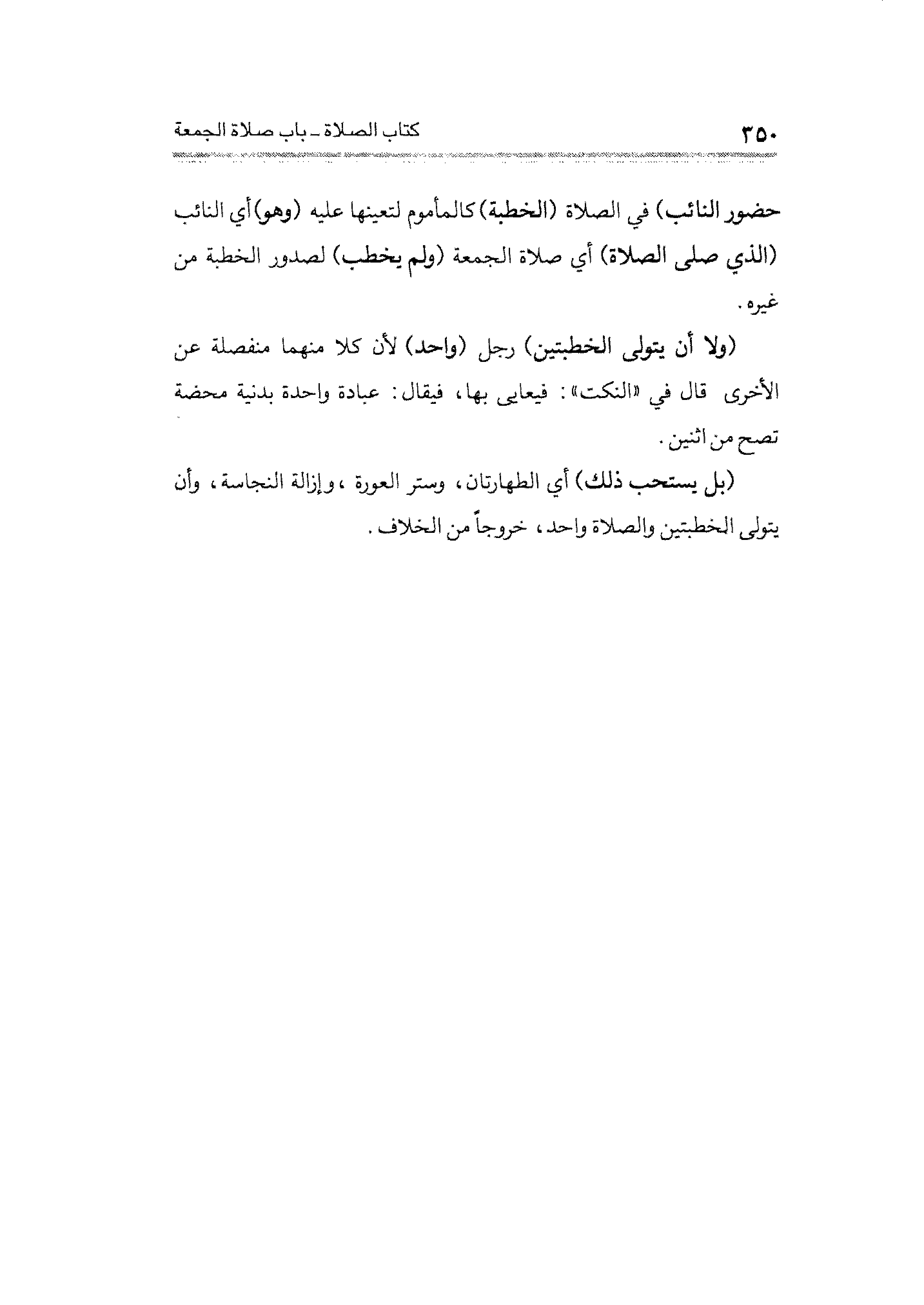 (بل يستحب ذلك) أي الطهارتان، وستر العورة، وإزالة النجاسة، وأن يتولى الخطبتين والصلاة واحد، خروجًا من الخلاف.