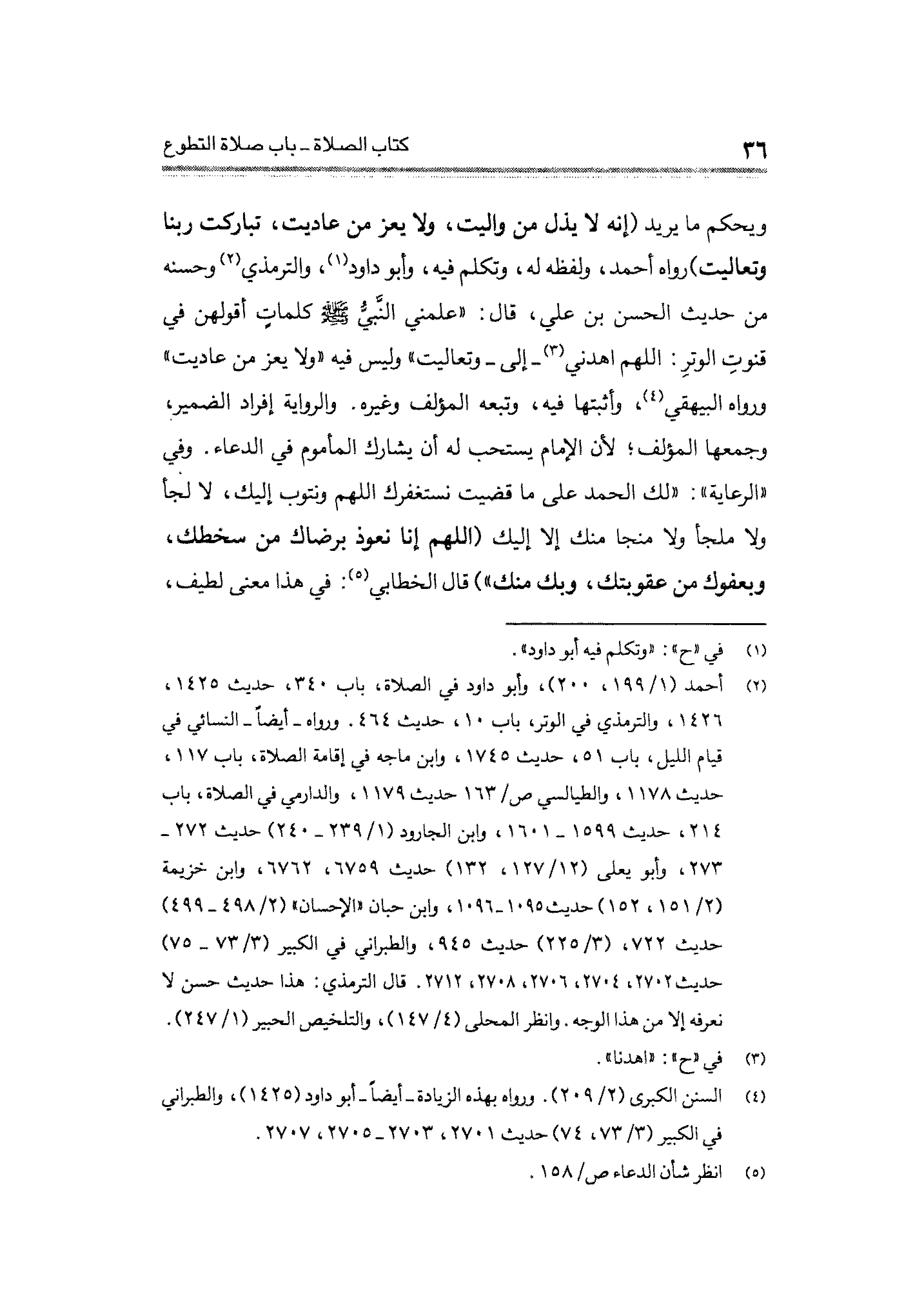 ويحكم ما يريد (إنه لا يذل من واليت، ولا يعز من عاديت، تباركت ربنا وتعاليت) رواه أحمد، ولفظه له، وتكلم فيه، وأبو داود (¬١)، والترمذي (¬٢) وحسنه من حديث الحسن بن علي، قال: "علمني النبي - صلى الله عليه وسلم - كلماتِ أقولهن في قنوتِ الوترِ: اللَّهم اهدني (¬٣) -إلى- وتعاليت" وليس فيه "ولا يعز من عاديت" ورواه البيهقي (¬٤)، وأثبتها فيه، وتبعه المؤلف وغيره. والرواية إفراد الضمير، وجمعها المؤلف؛ لأنَّ الإمام يستحب له أن يشارك المأموم في الدعاء. وفي "الرعاية": "لك الحمد على ما قضيت نستغفرك اللَّهم ونتوب إليك، لا لجأ ولا ملجأ ولا منجا منك إلَّا إليك (اللَّهم إنا نعوذ برضاك من سخطك، وبعفوك من عقوبتك، وبك منك") قال الخطابي (¬٥): في هذا معنى لطيف،