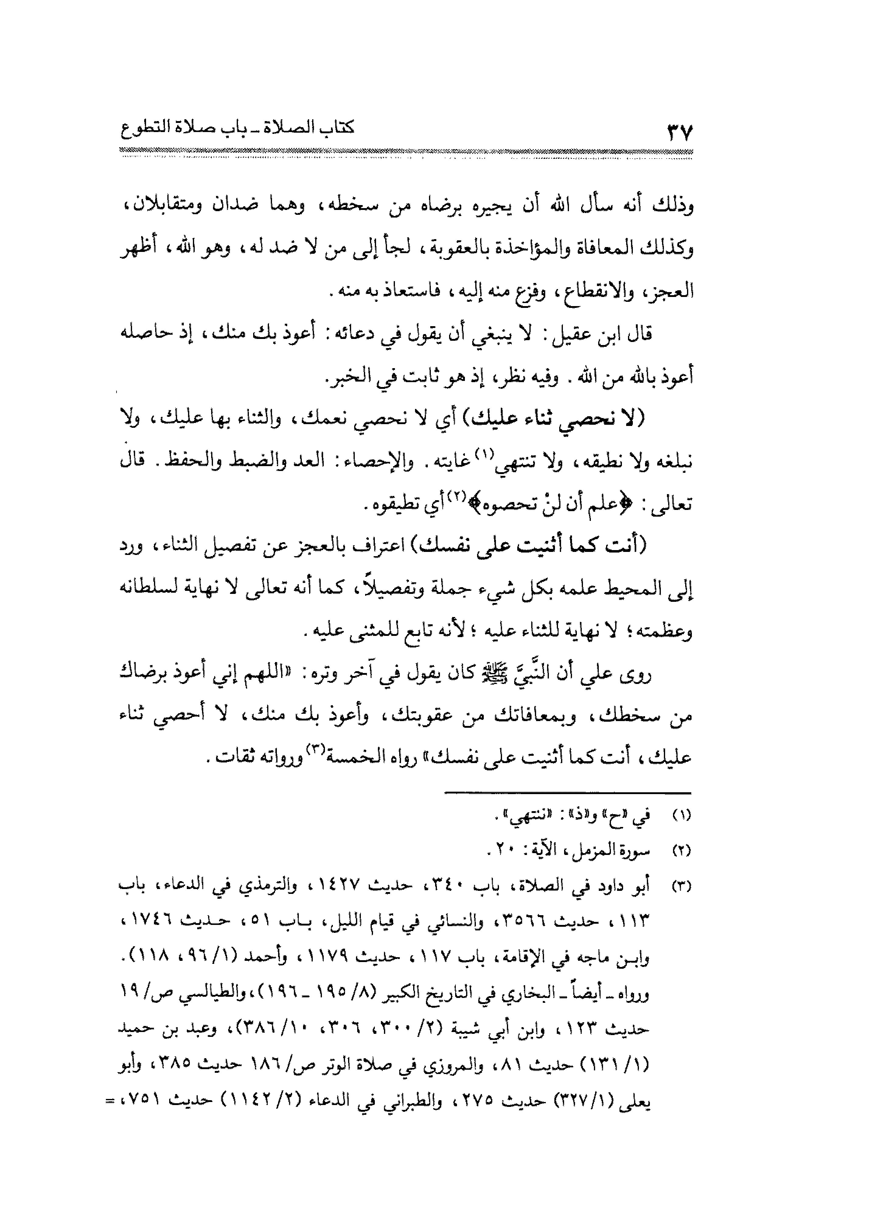 روى علي أن النَّبيّ - صلى الله عليه وسلم - كان يقول في آخر وتره: "اللَّهم إنِّي أعوذ برضاك من سخطك، وبمعافاتك من عقوبتك، وأعوذ بك منك، لا أحصي ثناء عليك، أنت كما أثنيت على نفسك" رواه الخمسة (¬٣) ورواته ثقات.